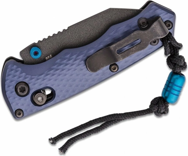 Den kompakte EDC-kniv Benchmade Full Immunity Crater Blue forener stil, holdbarhed og pålidelig ydeevne til hverdagsbrug. Den tilbyder en Wharncliffe-klinge i CPM M4-stål med Cobalt Black Cerakote-finish, sikker AXIS-lås samt et let grå-blåt skæfte i 6061‑T6 flyaluminium med clip og hul til snor.