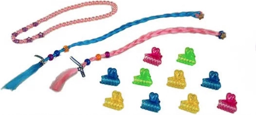 Pakken indeholder en række farverige håraccessories, der giver frisurerne et personligt præg.