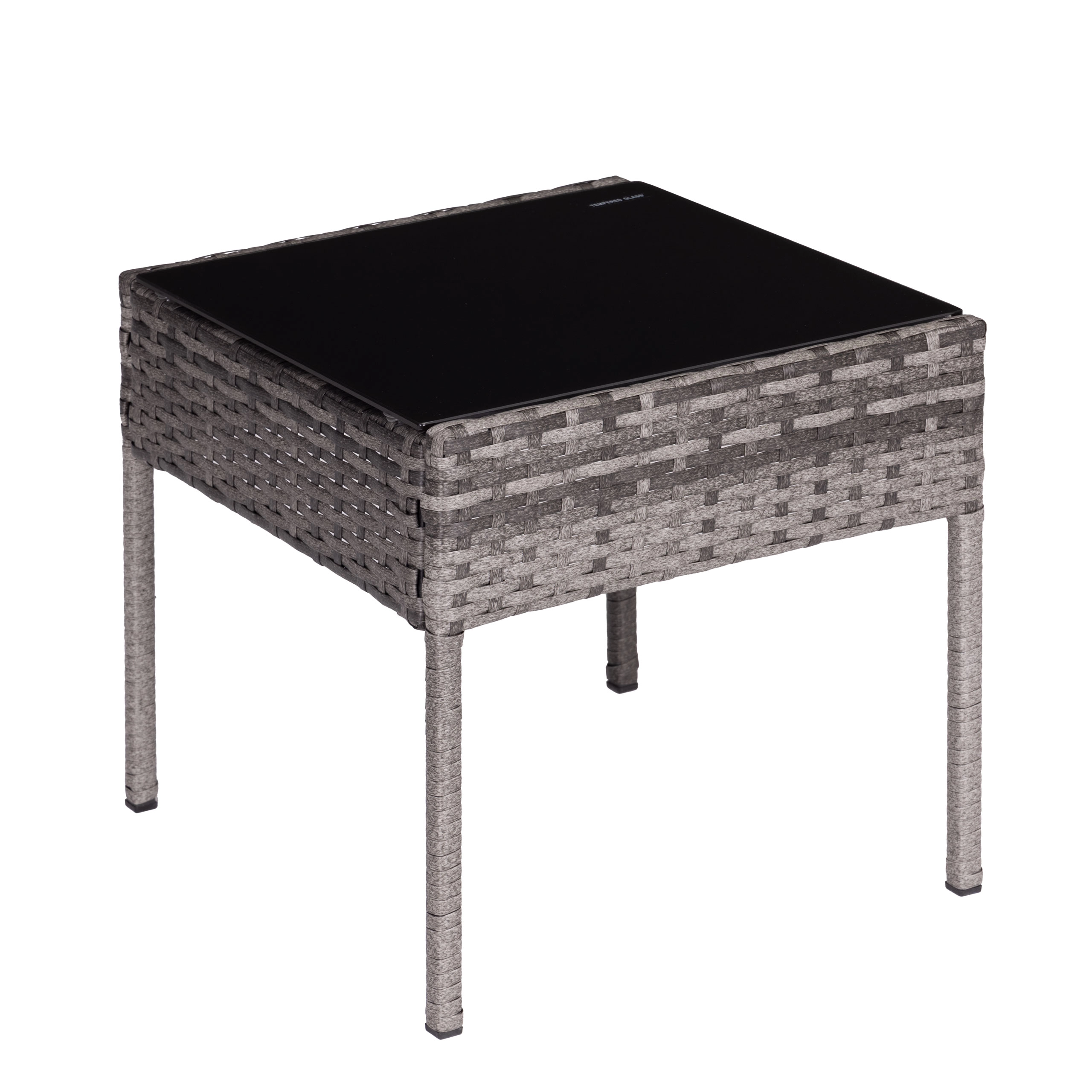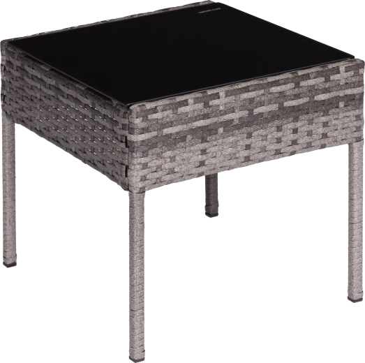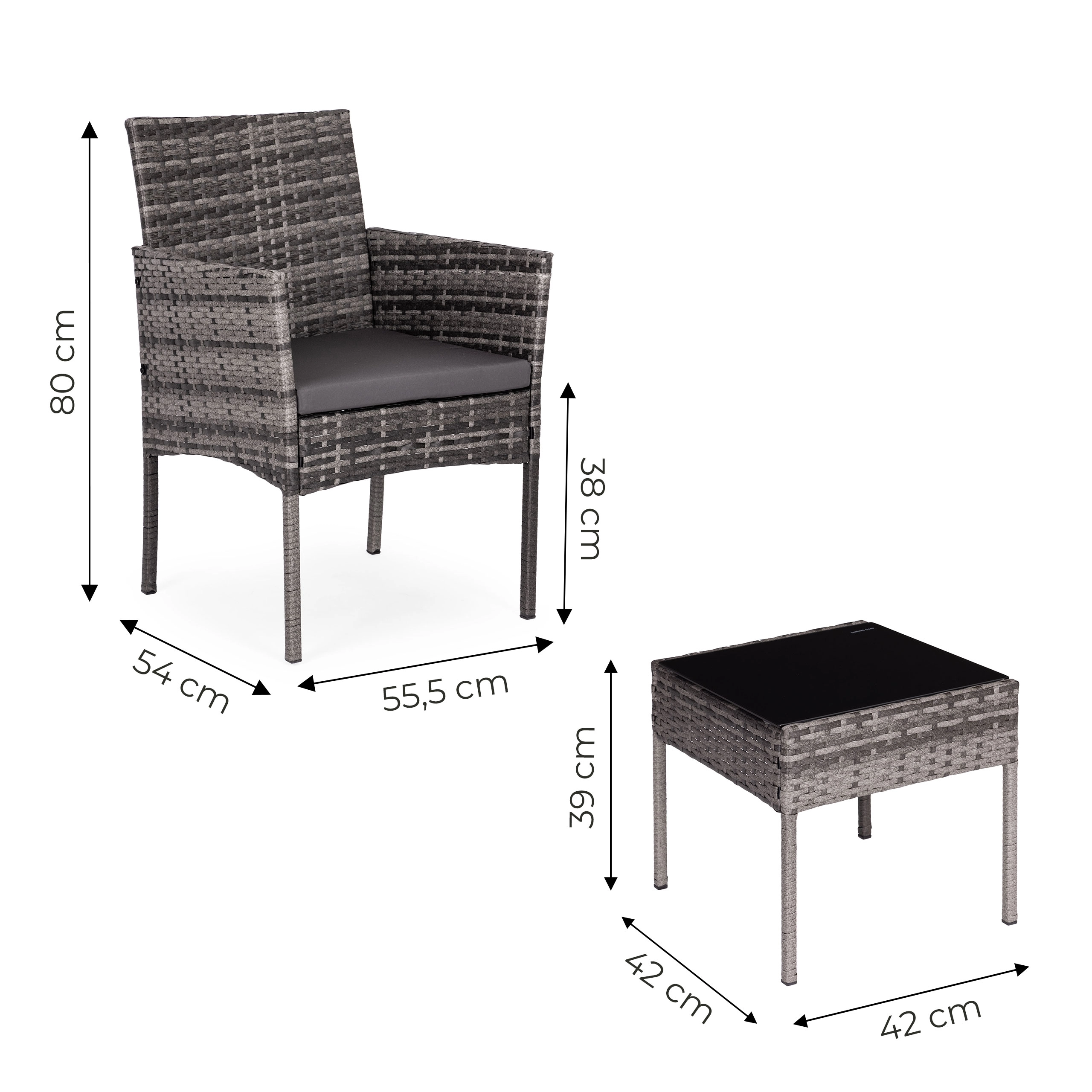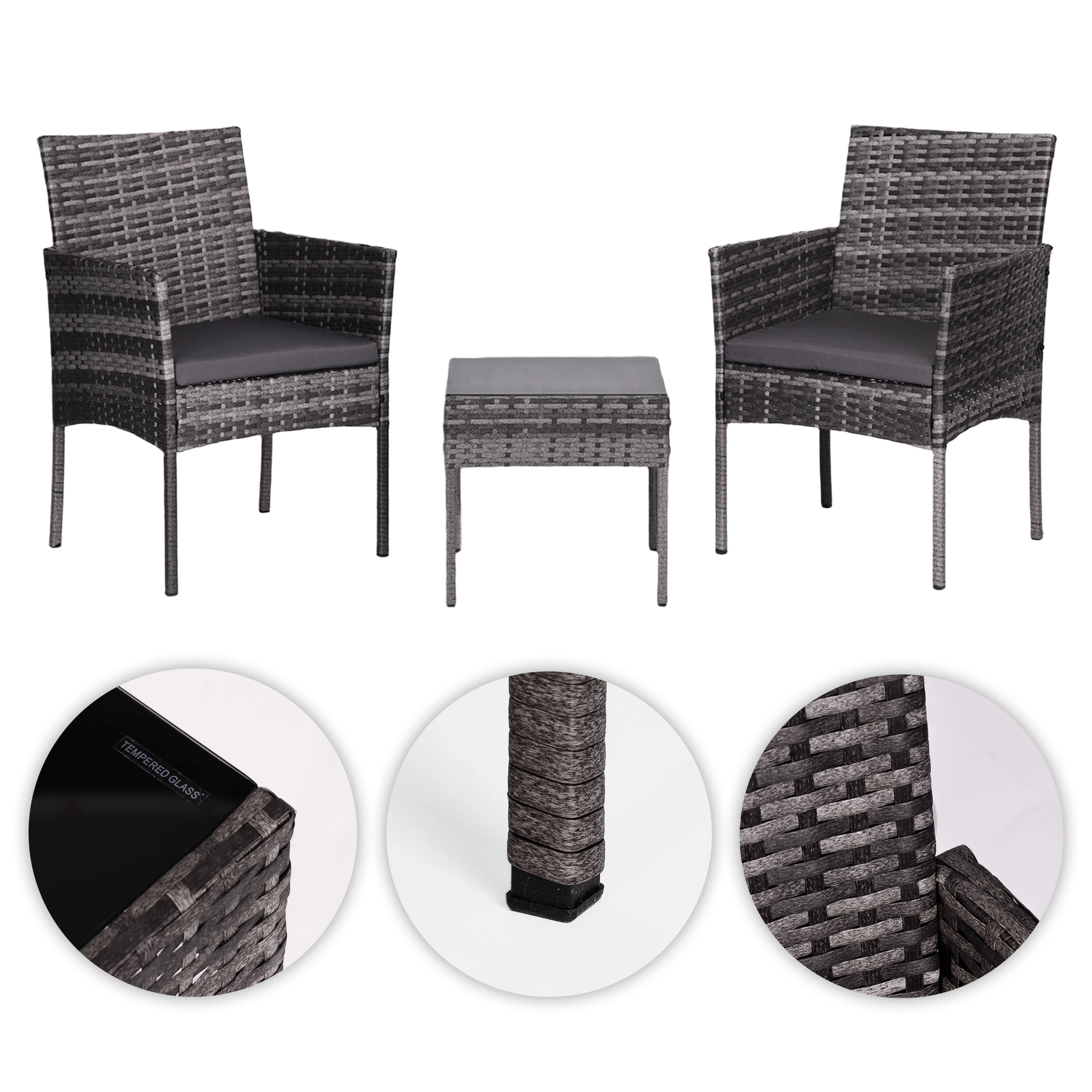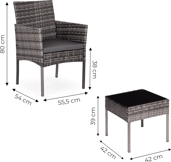 Det kvadratiske bord med sikker hærdet bordplade (5 mm) er ideelt til drikkevarer og småting, og lænestolene suppleres af bløde hynder med UV- og fugtbestandighed. Skridsikre endestykker på benene øger stabiliteten på forskellige underlag og beskytter gulvet.