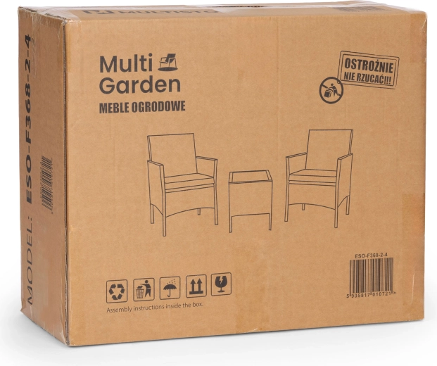 Stilfuldt havesæt til 2 personer fra MultiGarden kombinerer en holdbar stålkonstruktion og polyrattan med hærdet glas på bordet. Sættet inkluderer 2 komfortable lænestole med hynder af polyester 160 g/m². Møblerne er vejrbestandige, nemme at rengøre og passer perfekt til terrasse, altan og have.