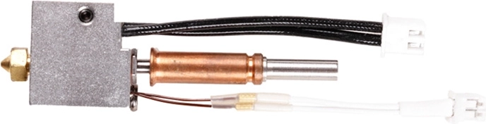 Den robuste konstruktion med messingdyse og præcist bearbejdet varmeblok understøtter ensartet opvarmning og jævn ekstrudering. Forudmonterede kabler med stik gør hurtig udskiftning uden kompliceret montage nemt.
