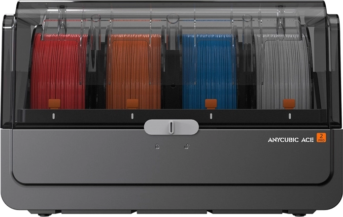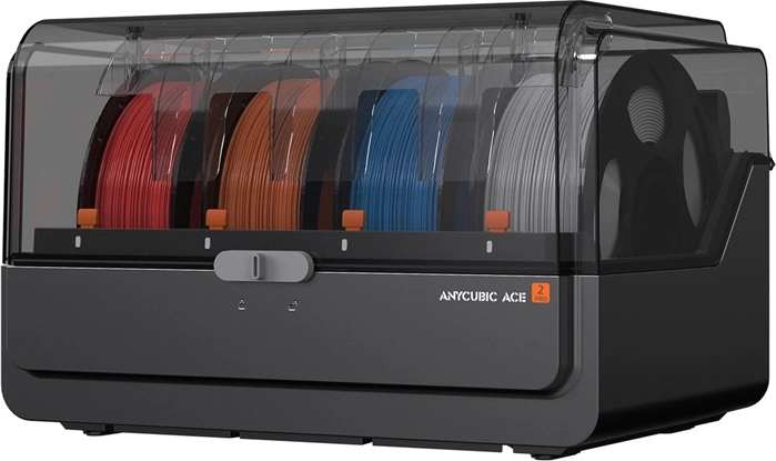 Anycubic Ace 2 Pro løfter multimateriale 3D-print til et nyt niveau. Med fire uafhængige børsteløse motorer leverer den jævn og præcis indføring med minimal risiko for stop og hurtig filamentudskiftning på cirka 56 sekunder. Integreret tørring op til 65 °C og aktiv affugtning holder materialet i optimal stand og sikrer højere printkvalitet.