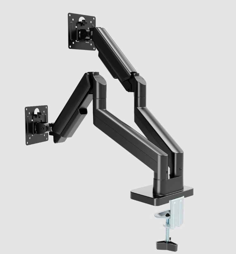 Universel dobbelt bordarm til skærme med en diagonal på 17–32" og en bæreevne på op til 10 kg pr. skærm. Tilbyder trinløs højdejustering takket være gasfjedre, rotation, tilt og pivot til stående visning samt integreret kabelhåndtering for en ryddelig og ergonomisk arbejdsplads.