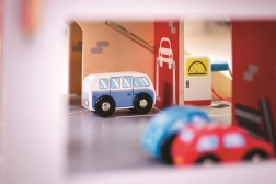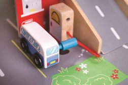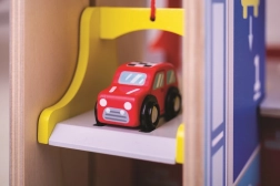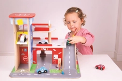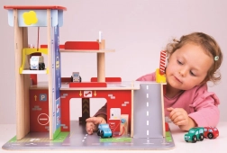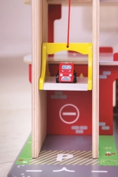 Børn vil elske sjov leg på hver af de tre etager i garagen med parkeringsplads. I stueetagen kan de køre bilen ind i den fungerende elevator og derefter køre op til anden sal og parkere. I stueetagen finder børnene et værksted, en vaskehal og en tankstation. Fra første sal kan bilerne køre af sted ved hjælp af elevatoren eller via rampen – men pas på, bilerne skal vente, til bommen er løftet! Det højeste punkt på garagen er en helikopterlandingsplads. Denne garage har simpelthen alt, hvad en lille chauffør behøver for at komme fra A til B. Understøtter kreativitet og fantasi. Udvikler hånd-øje-koordination, finmotorik og fingerfærdighed. Kan suppleres med biler fra Bigjigs Toys og Bigjigs Rail. Fremstillet af kvalitetsmaterialer fra ansvarlige kilder. Vigtigste egenskaber: 3 etager med parkeringsplads og helipad, fungerende elevator, værksted, vaskehal og tankstation i stueetagen.