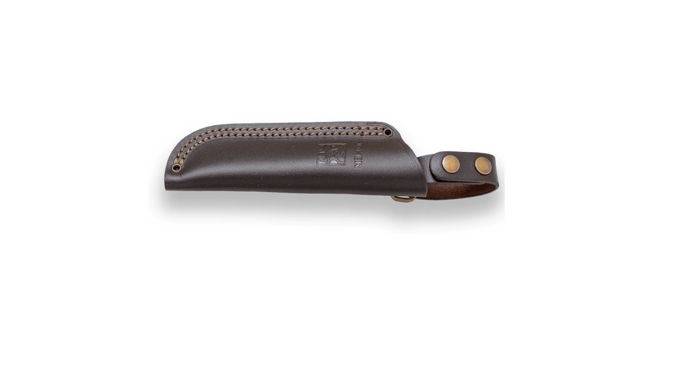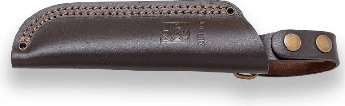 Den fulde full‑tang-konstruktion sikrer styrke og lang levetid. Skæftet af ægte hjortegevir ligger sikkert i hånden, tre nitter øger stabiliteten, og en hul endenitte gør det muligt at montere en snor. Læderskeden gør det nemt at bære på bæltet og beskytter klingen under transport.