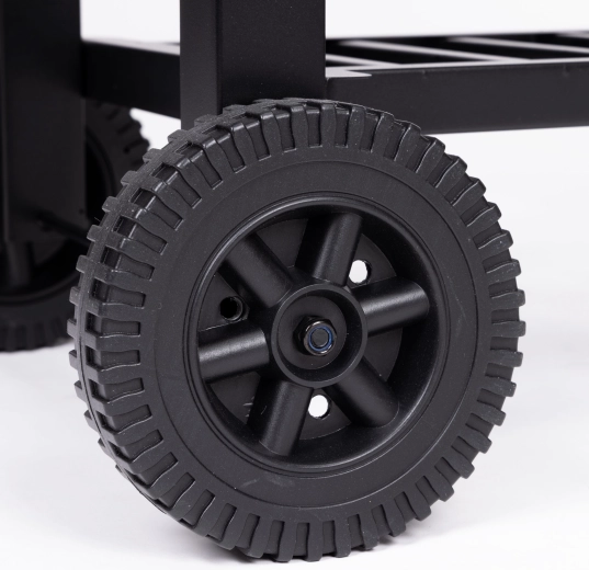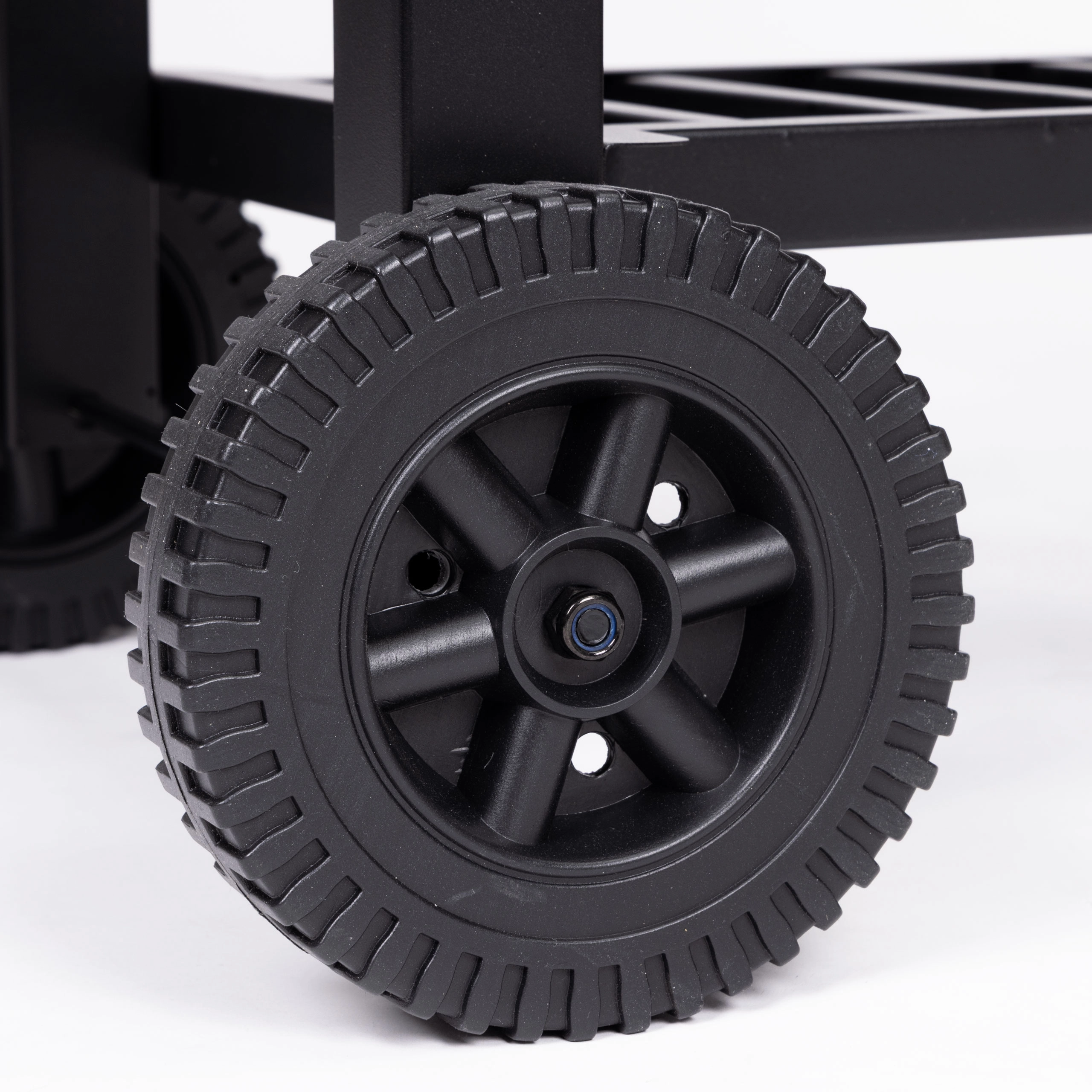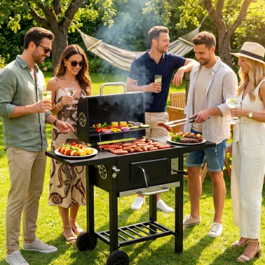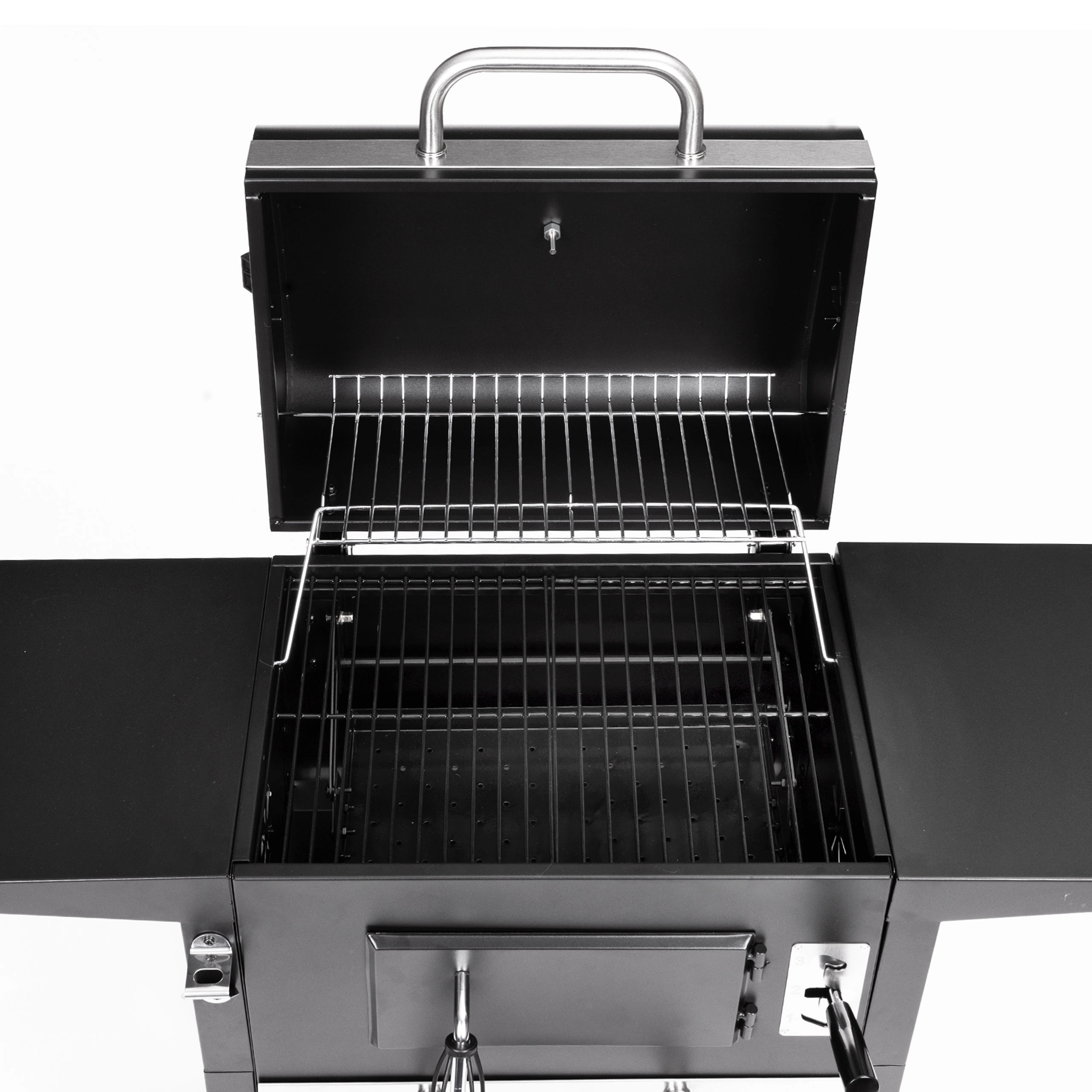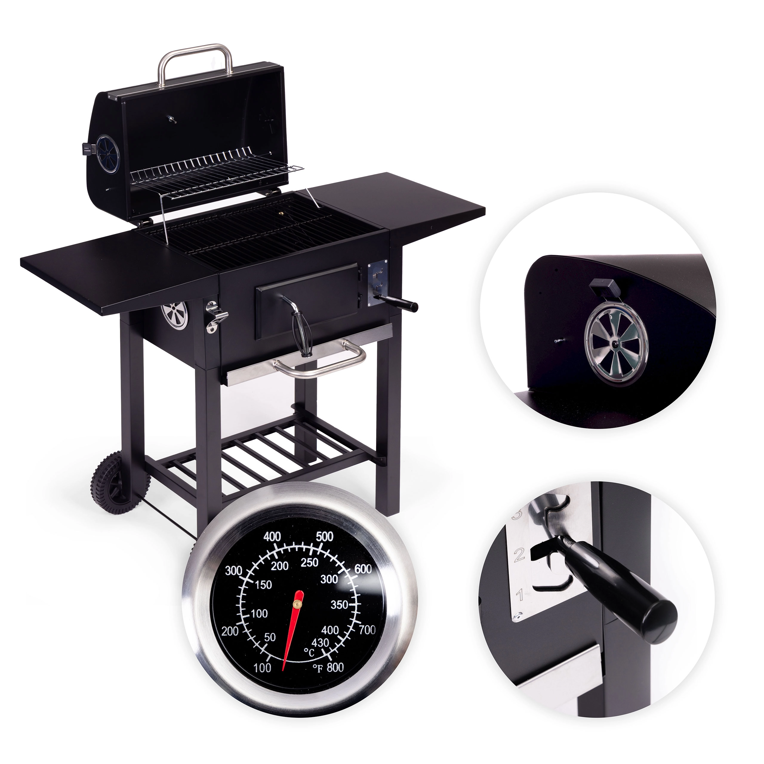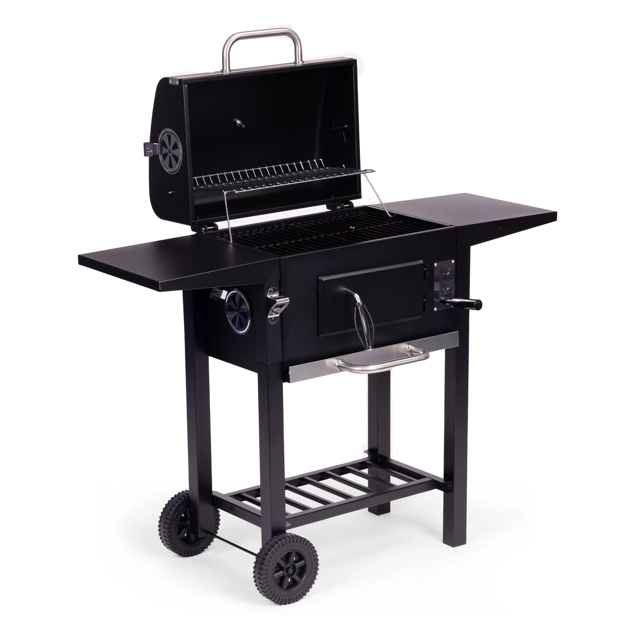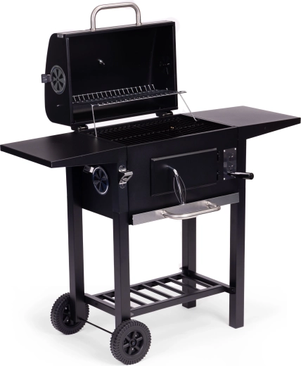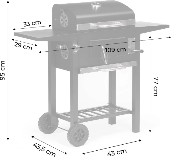 Hovedristen på 45×33 cm suppleres af en øvre varmerist på 38×19 cm til at holde færdige retter varme. To sidehylder på 33×29 cm giver plads til krydderier og tilbehør, og den nederste opbevaringsrist forbedrer arbejdets organisering. Med den udtrækkelige askeskuffe er vedligeholdelsen hurtig og ren, og frontlågerne til fyrboksen gør det nemt at fylde kul på under grillningen.