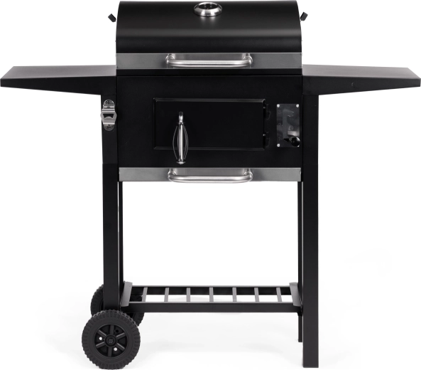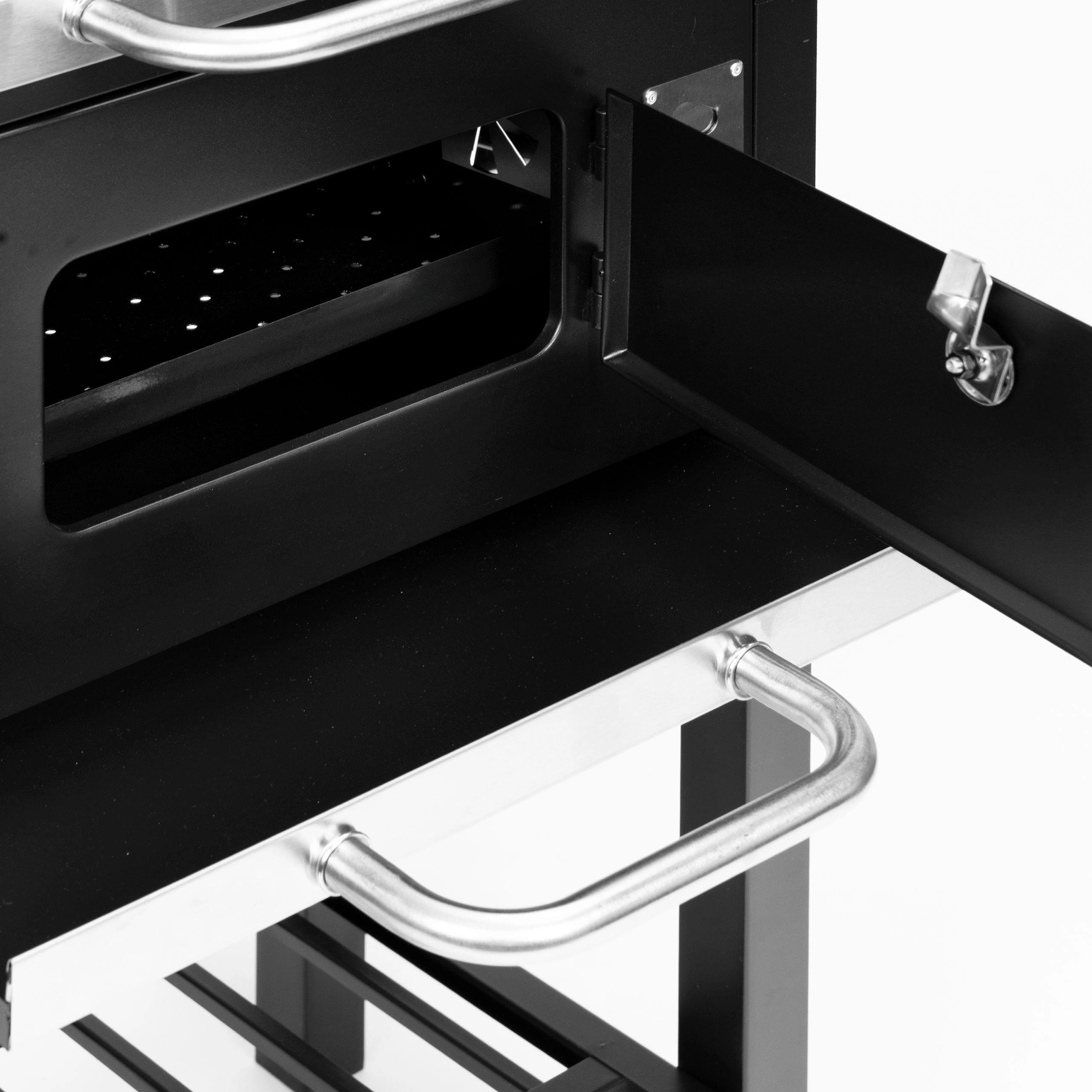 Udtrækkelig askeskuffe til hurtig rengøring, frontlåger til påfyldning af kul, to sidehylder og en nederste opbevaringsrist for optimal organisering.