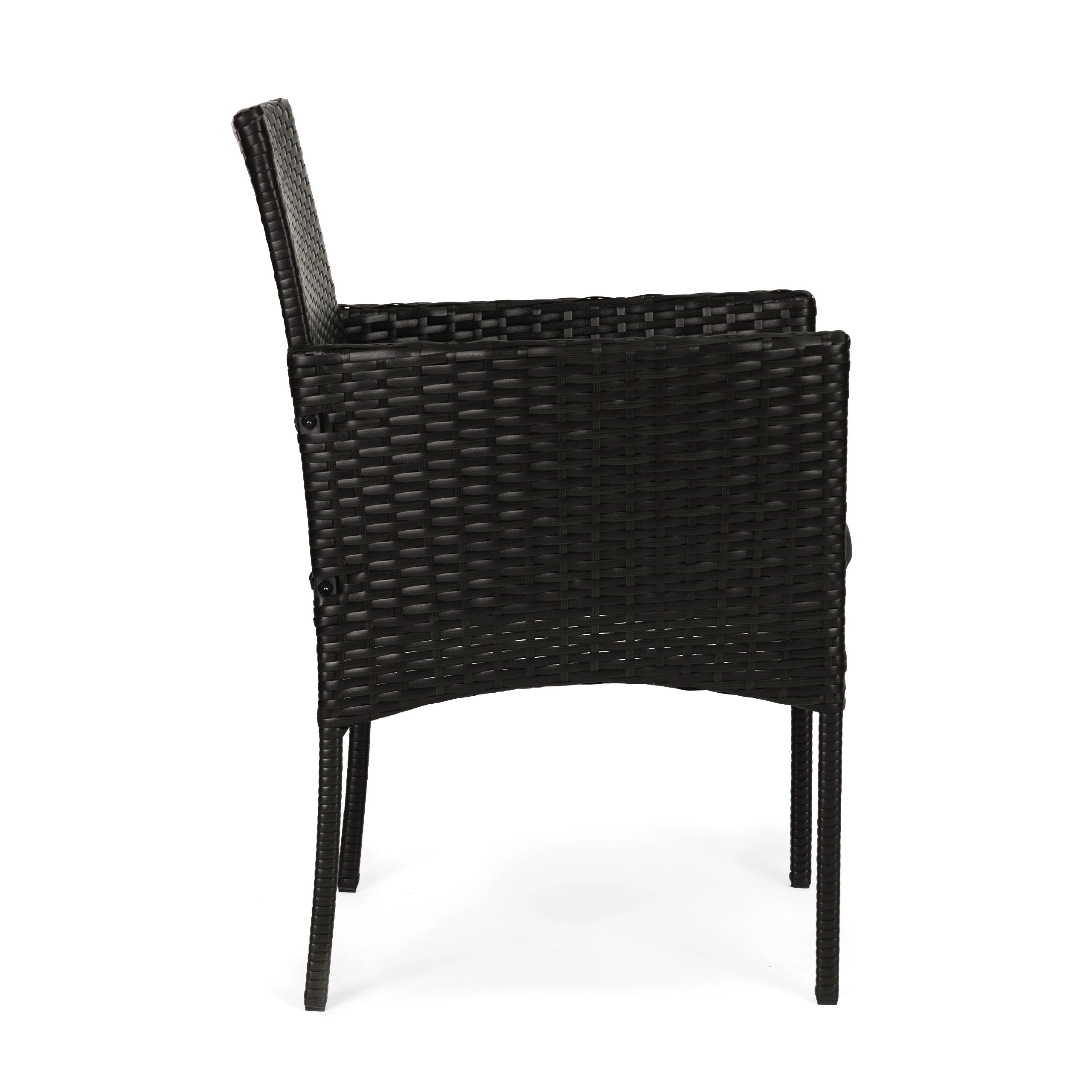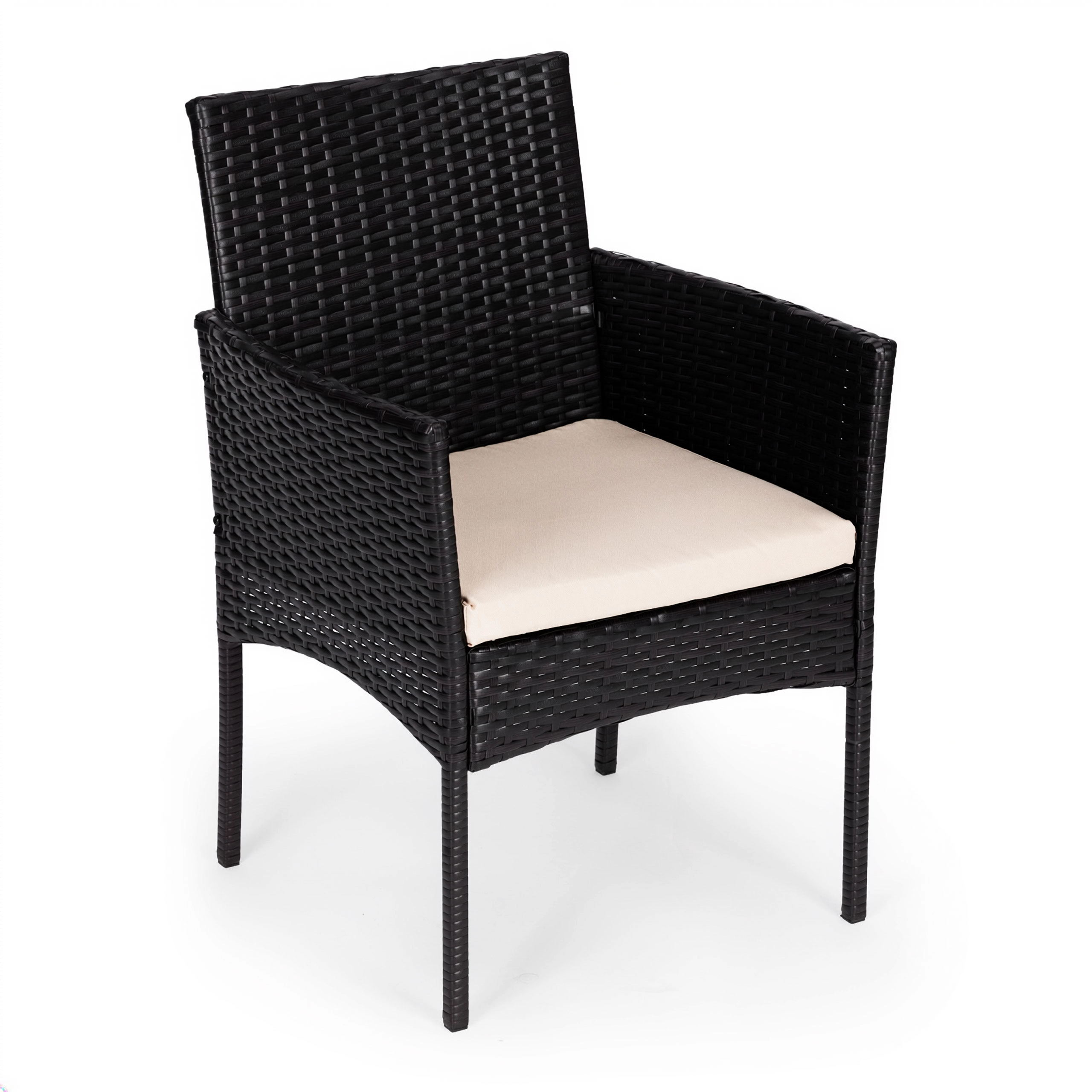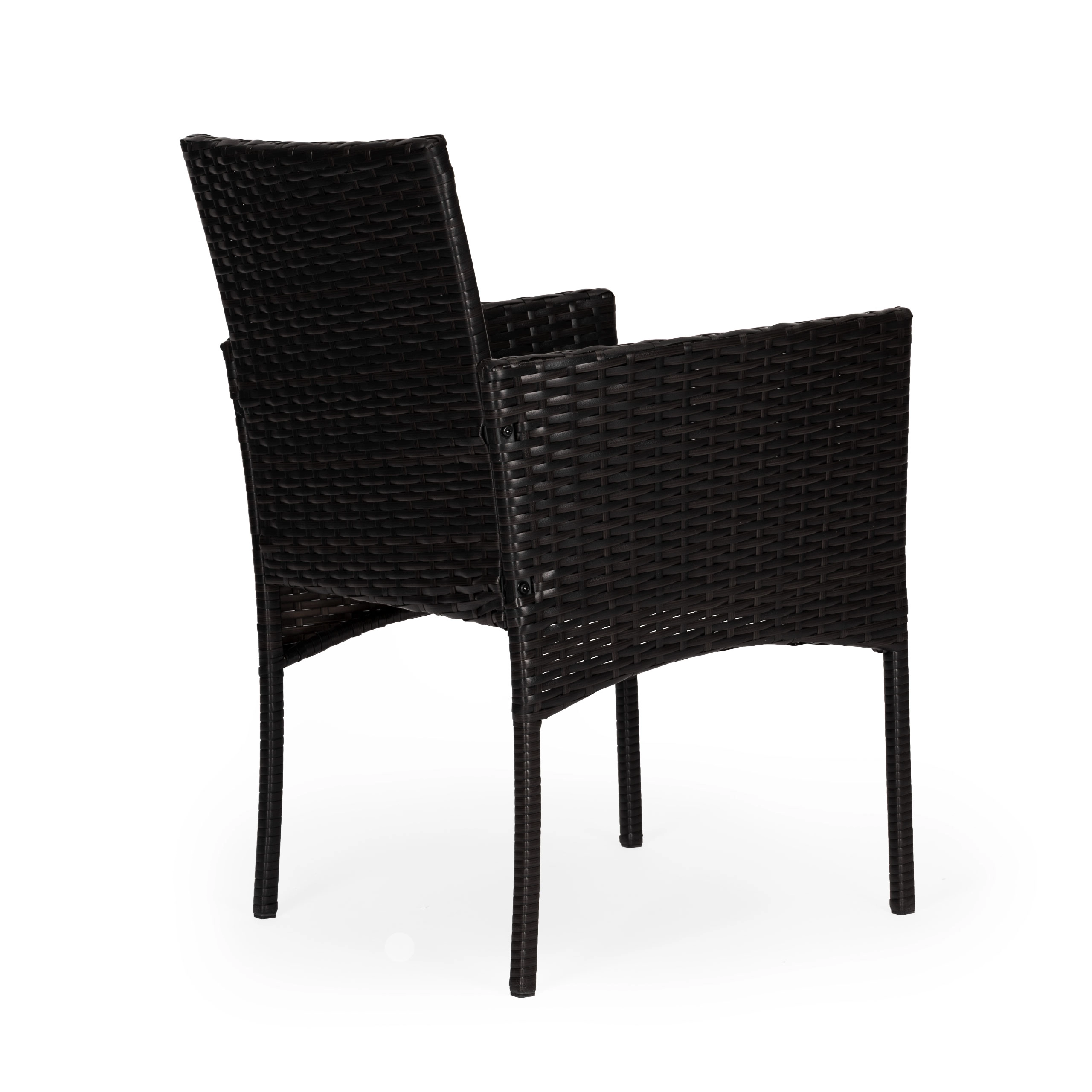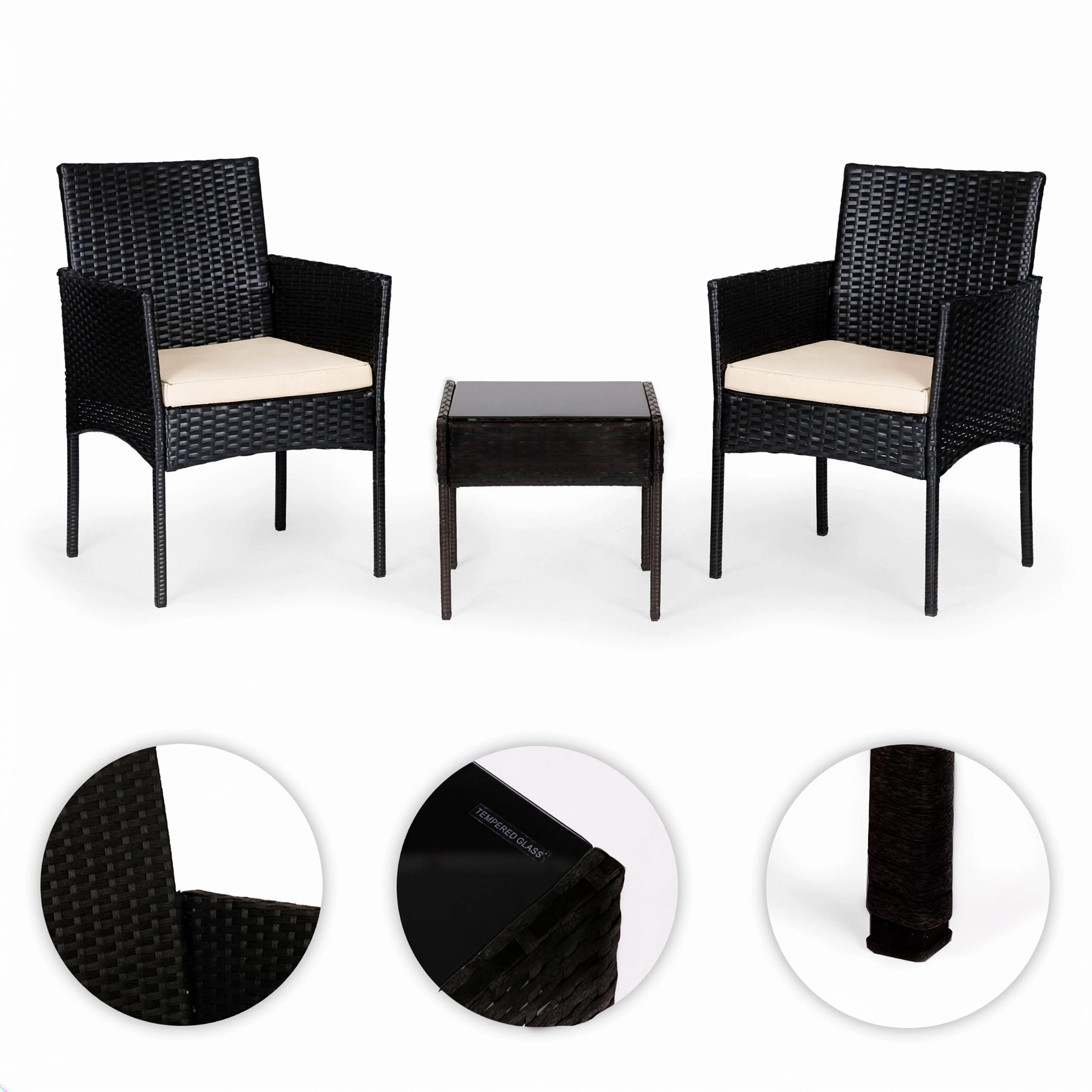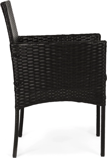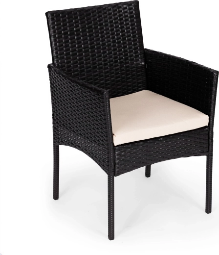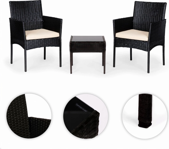 Lænestolene er fremstillet af holdbart polyrattan med en solid stålkonstruktion. Hynder i polyester 160 g/m² er velegnede til udendørs brug og giver behagelig siddekomfort. Bordet har hærdet glas på 5 mm for sikker daglig brug. Skridsikre fødder sikrer stabilitet og beskytter underlaget.