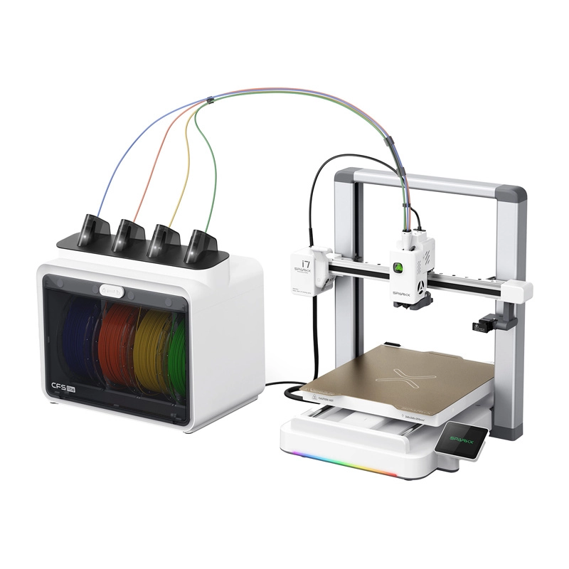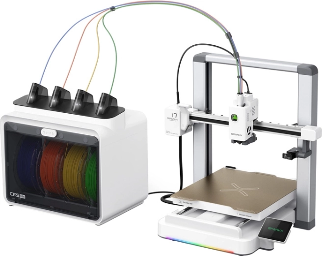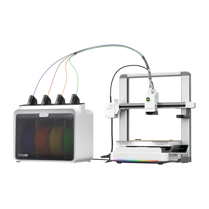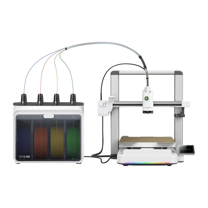 CFS Lite-modulet gør det muligt at kombinere fire farver eller materialer i én model. RFID genkender automatisk filamentet, og auto‑refill skifter problemfrit til næste spole ved lange udskrifter.
