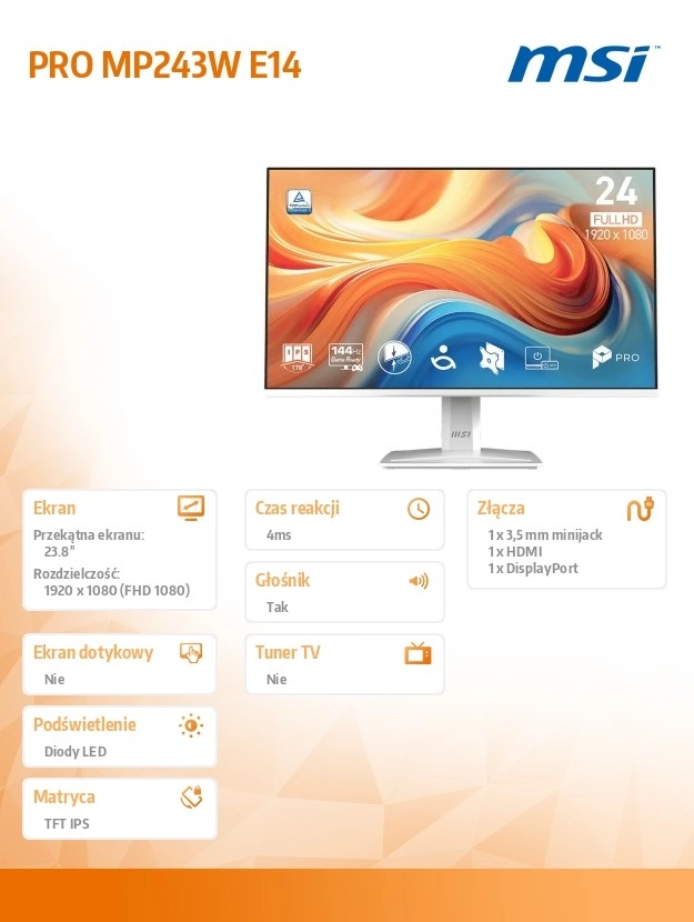 Det minimalistiske hvide design med slank profil passer elegant på ethvert bord. Det stabile stativ med fremragende støtte og mulighed for tilt gør det nemt at finde en behagelig indstilling. Det moderne panel er optimeret til heldagsbrug – fra arbejde og studier til underholdning.