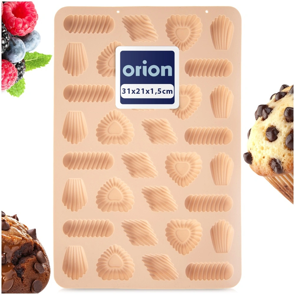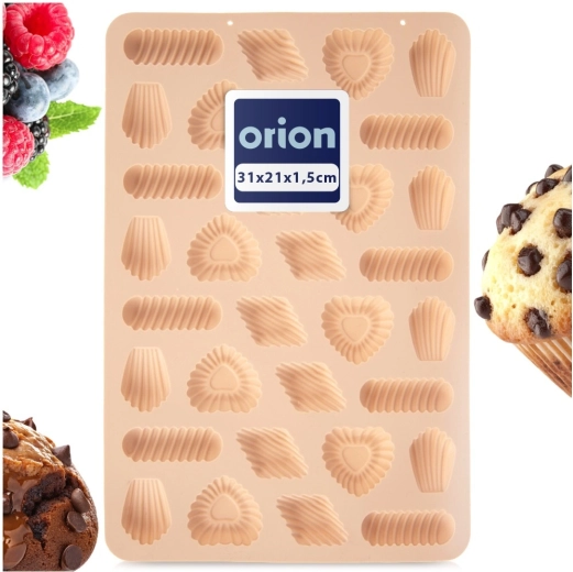 Praktisk silikoneform til bagning af op til 32 stk. sprøde småkager, chokolader eller praliner i 4 dekorative former. Fremstillet af kvalitets, fleksibel silikone i beige med non-stick overflade for nem udtagning uden at smøre. Varmebestandighed -40 °C til +220 °C, egnet til ovn, mikrobølgeovn og fryser, og tåler opvaskemaskine. Originalt produkt fra ORION.
