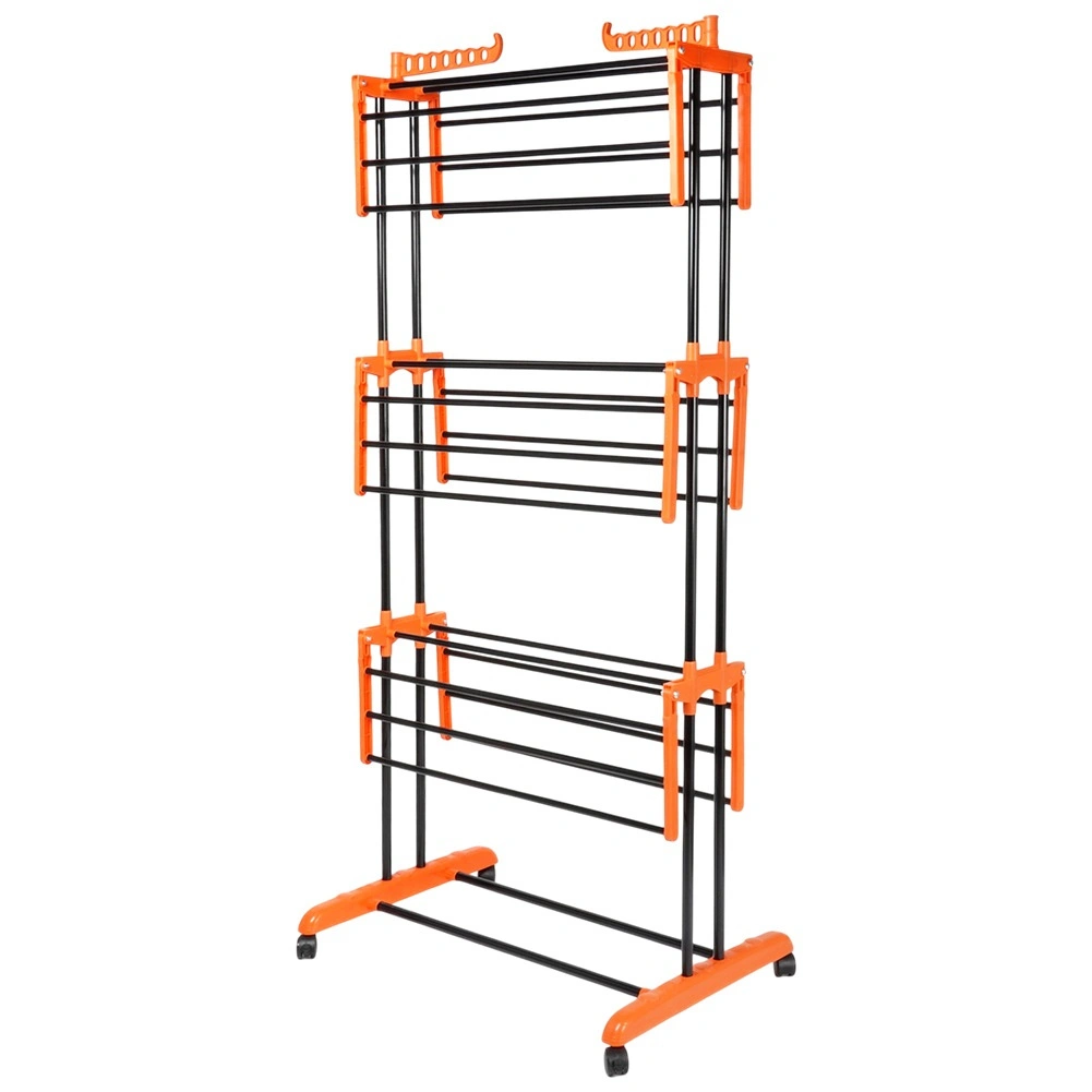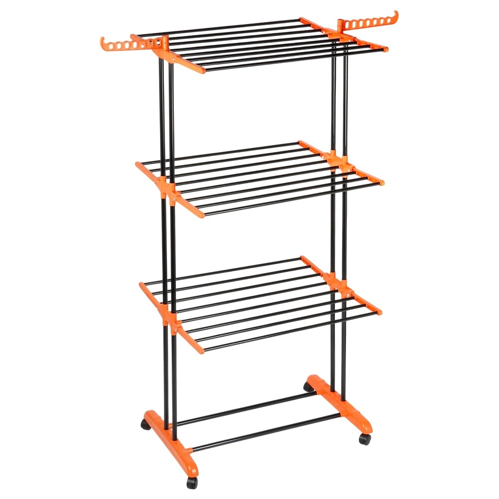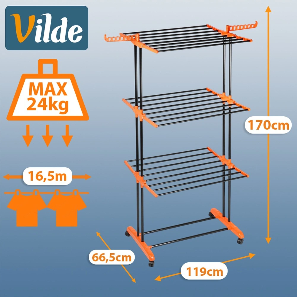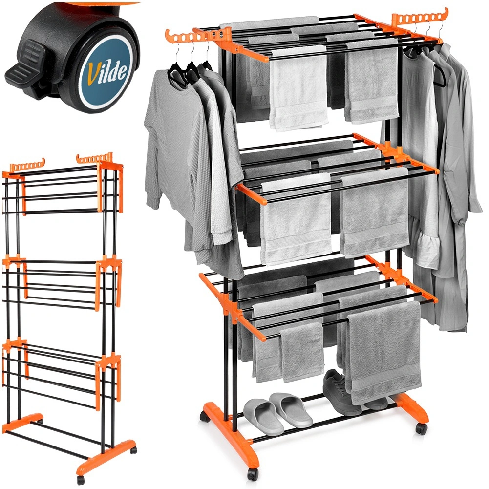 Praktisk tørrestativ i tre niveauer med robust metalkonstruktion og hjul for nem flytning. Tilbyder op til 16,5 m tørreflade, 24 solide stænger, sammenklappelige vinger og sidearme til bøjler for maksimal udnyttelse af pladsen. Takket være den stabile ramme og to låsbare hjul er den ideel til lejlighed, altan eller terrasse.