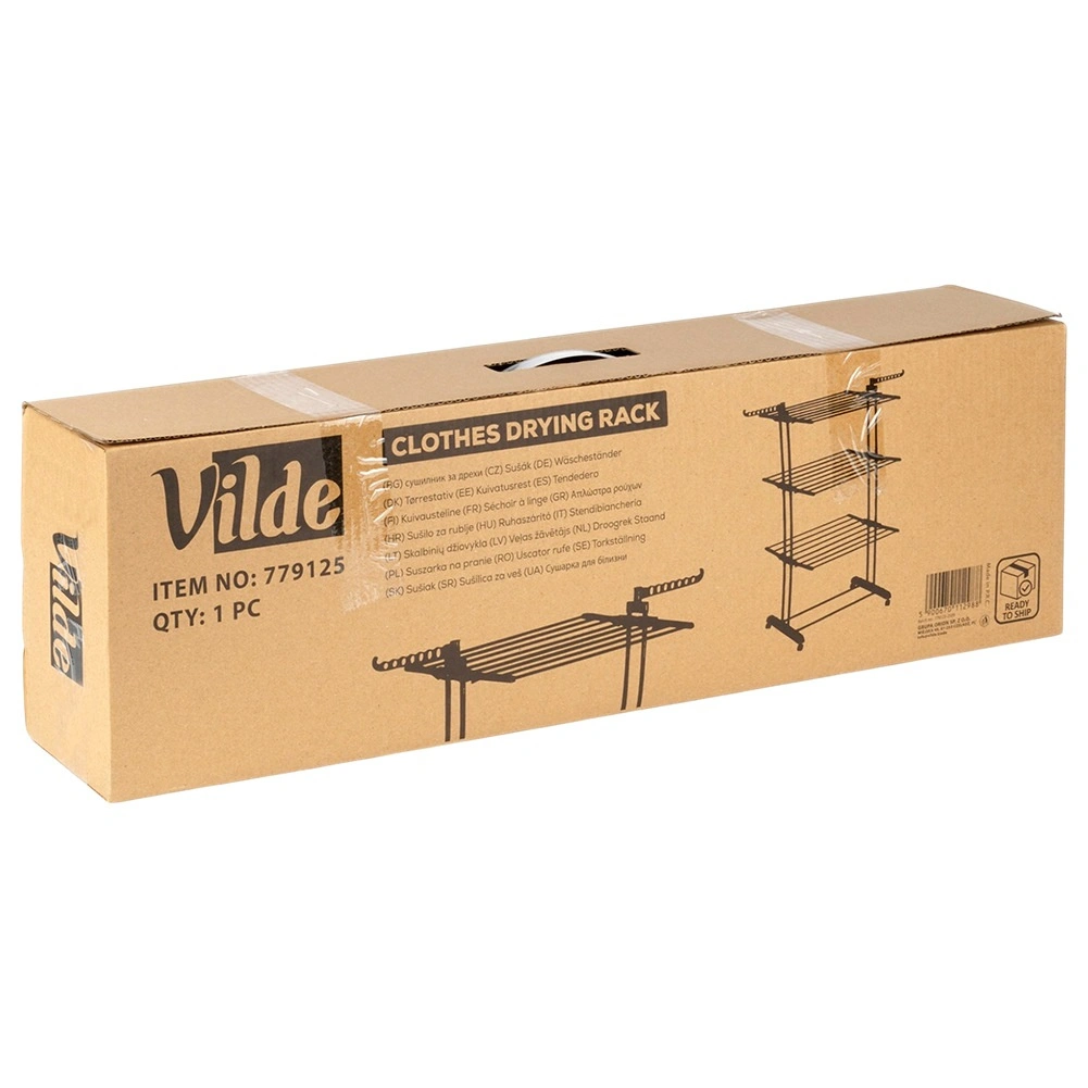 Seks uafhængige, sammenklappelige vinger kan tilpasses efter længde og volumen på tøjet. Sidearme med huller til bøjler er perfekte til skjorter eller frakker, og den nederste hylde er velegnet til tørring af fodtøj og tilbehør. Fire hjul, hvoraf to med bremse, giver nem flytning uden at ridse gulvet.