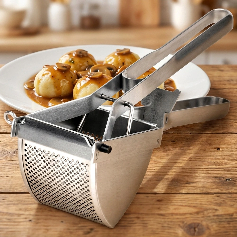 Rustfri kartoffelpresser er en uundværlig hjælper til glat kartoffelpuré, kløser, kroketter, pyzy og dumplings. Den fint perforerede kurv presser de kogte ingredienser jævnt og giver en let, luftig struktur uden klumper.