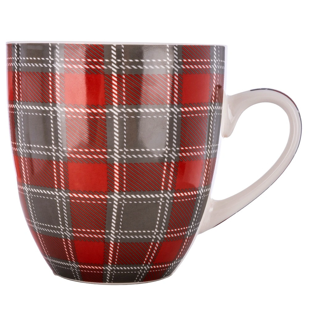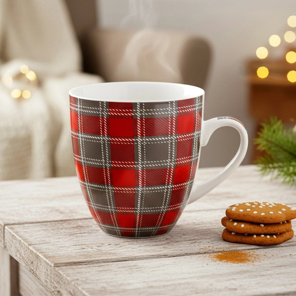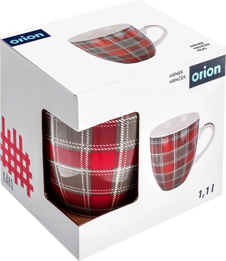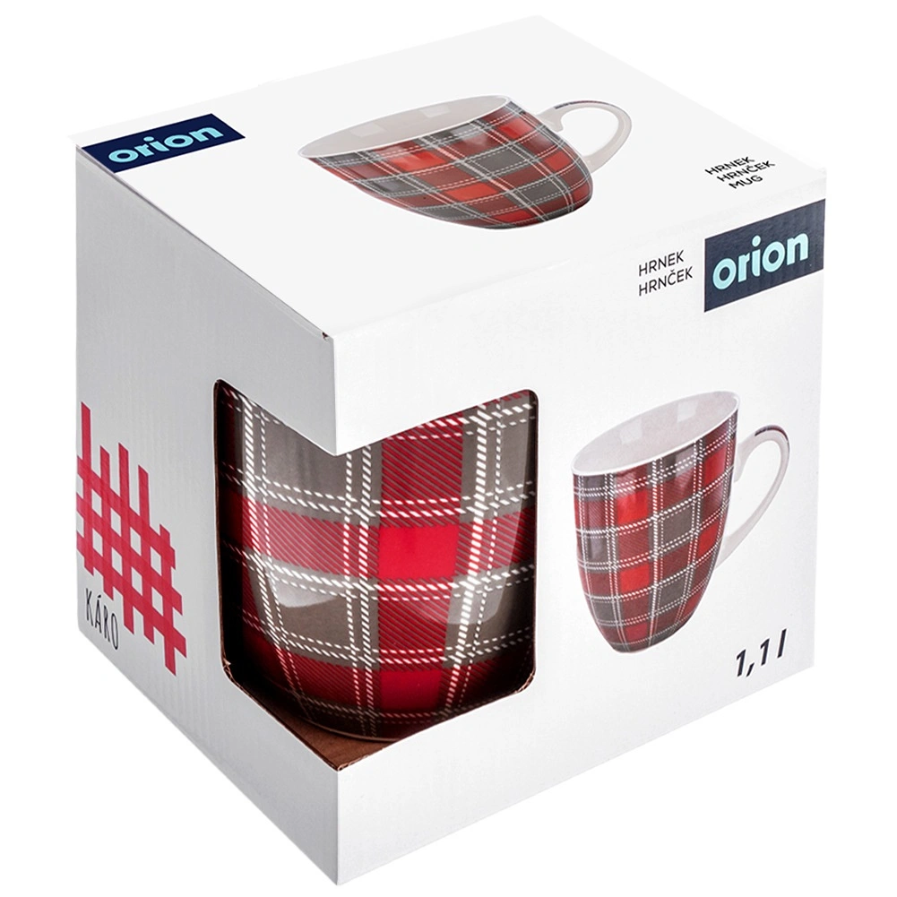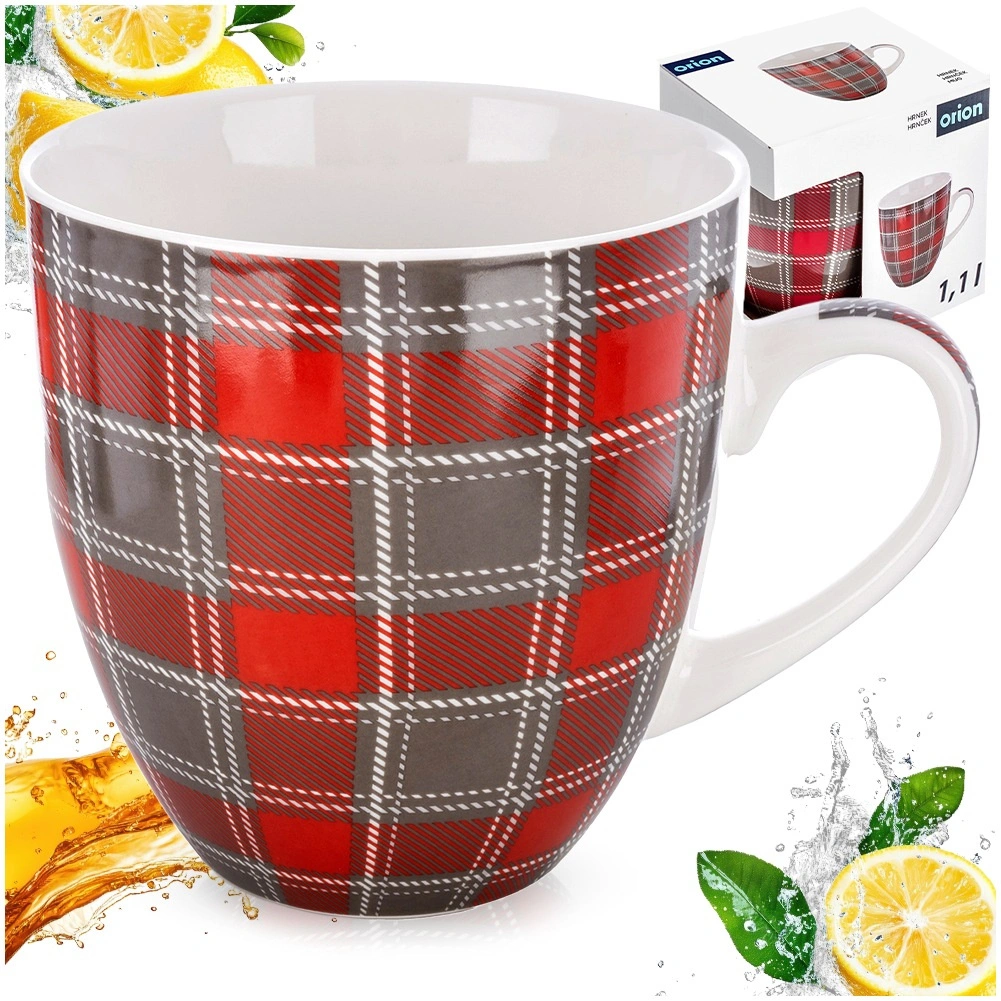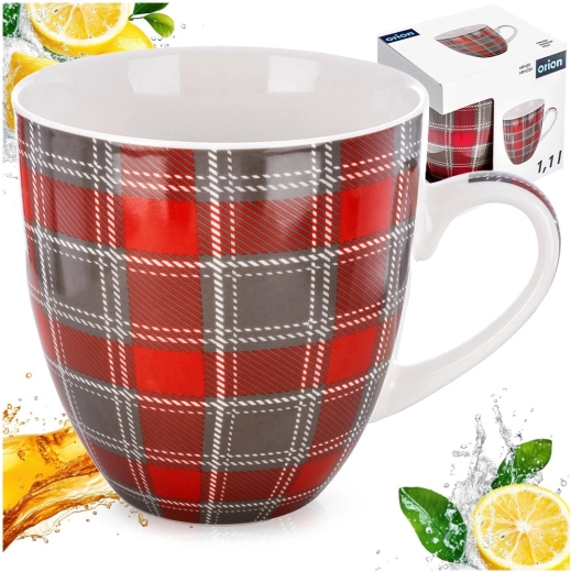 Stort porcelænskrus med en kapacitet på 1 liter, behageligt håndtag og stilfuldt ternet mønster i rød‑grå farve. Ideelt til kaffe, te og kakao, egnet til opvaskemaskine og mikrobølgeovn. Kvalitetsporcelæn sikrer lang levetid og sikker kontakt med fødevarer.