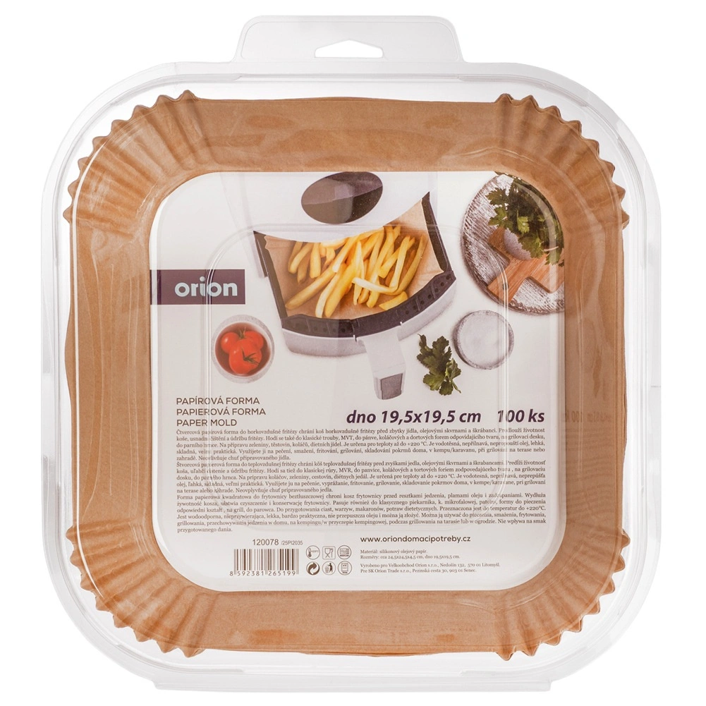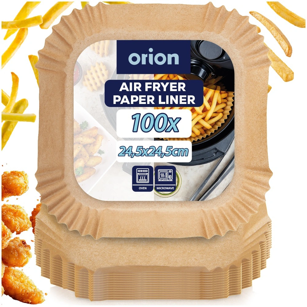 Hold din airfryer helt ren med praktiske papirindsatse i størrelsen 24,5 × 24,5 cm. Pakken indeholder 100 stk. solide indsatsark af olieret papir, som er non-stick, fedt- og vandafvisende og velegnede til både ovn og mikrobølgeovn. De er nemme at bruge, gør rengøringen hurtigere og beskytter airfryerkurven mod snavs.