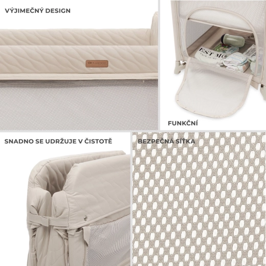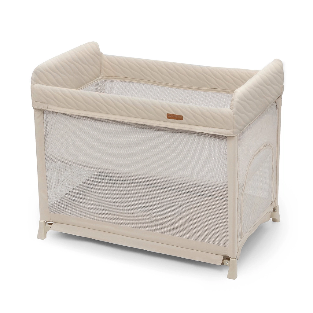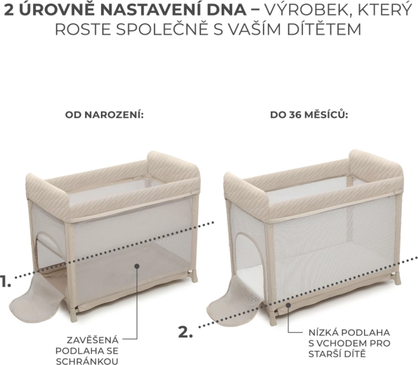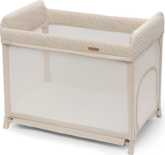 Den praktiske ophængte bund skåner ryggen, når du lægger en nyfødt ned (indtil barnet begynder at rejse sig selv). Når madrassen sænkes, får du god plads i bunden, og barnet kan selv gå ind via sideindgangen med lynlås. Den testede madras med bomuldsbetræk følger med og kan let vaskes. De holdbare og let rengørlige materialer aftørres blot med en fugtig klud.