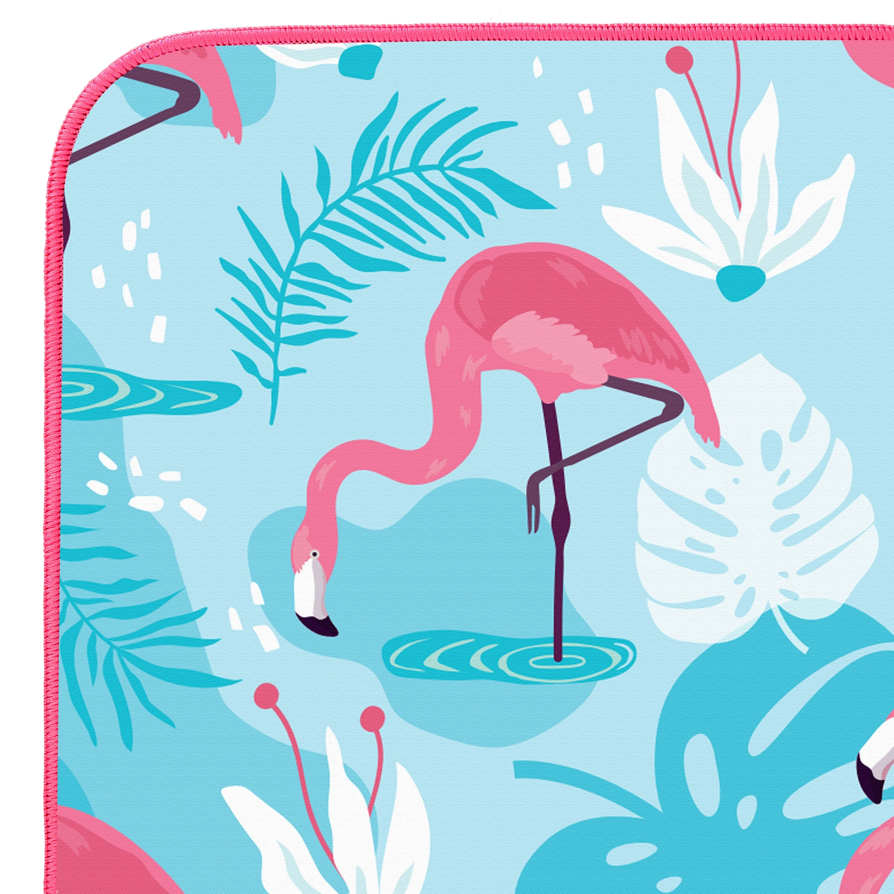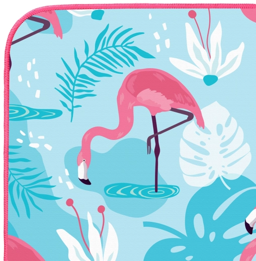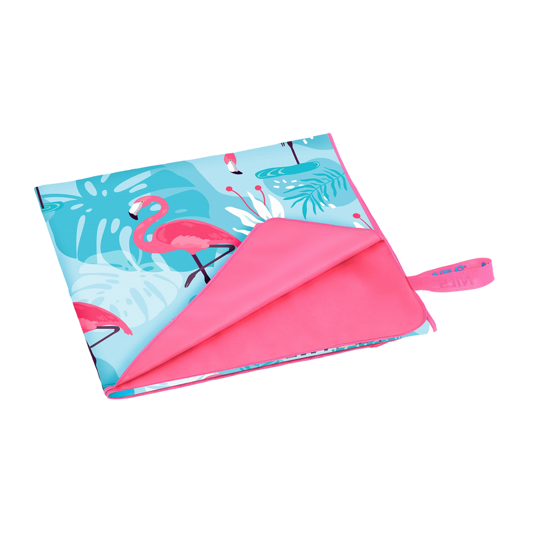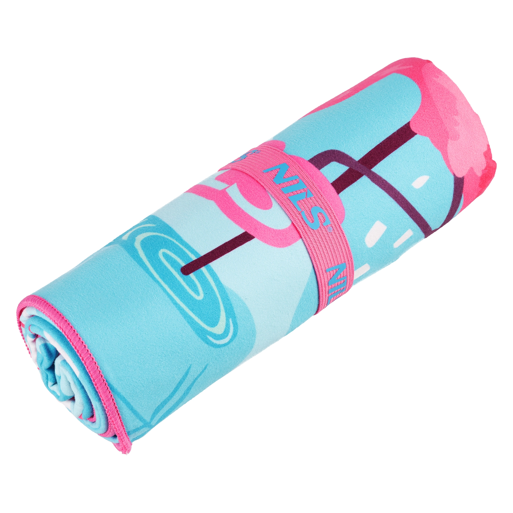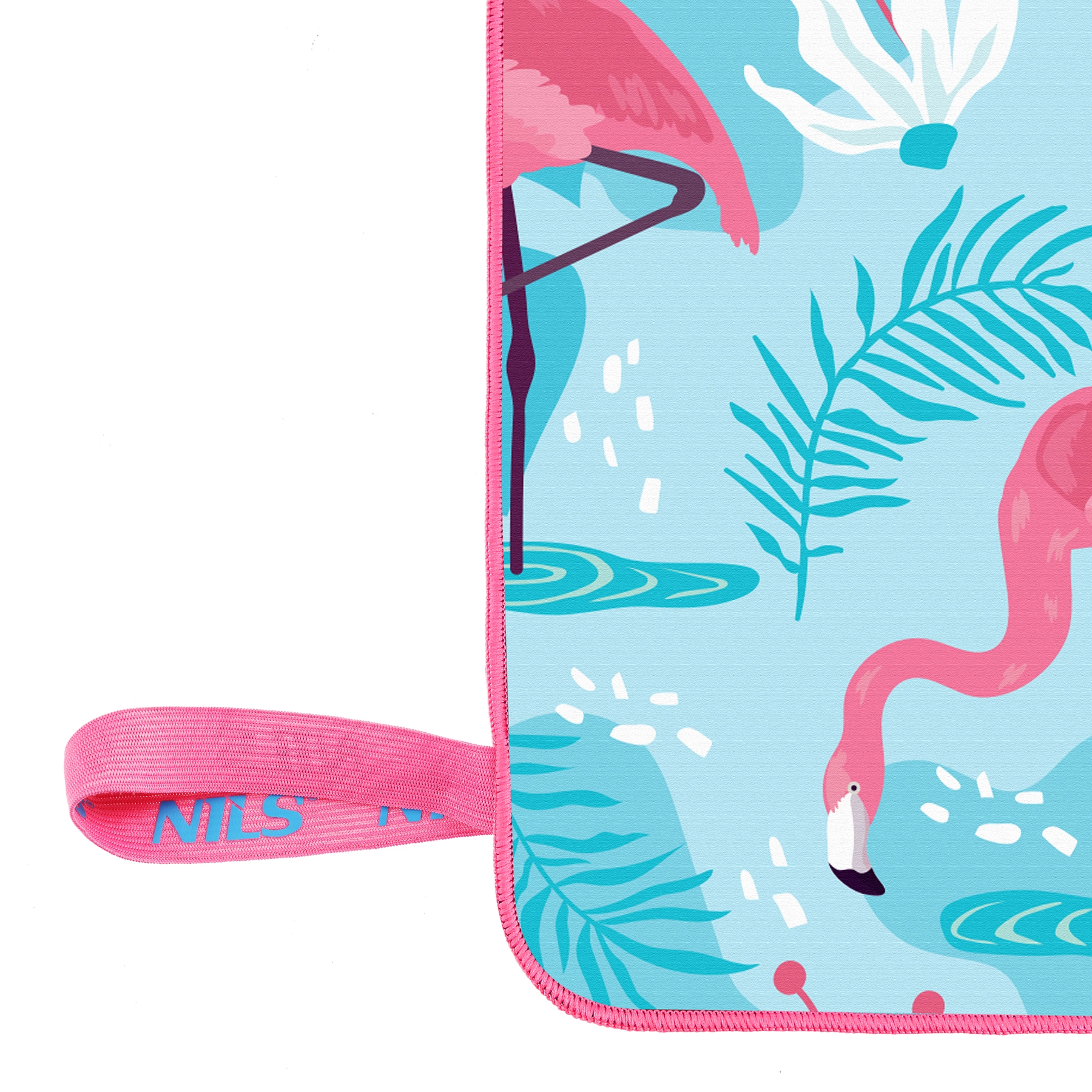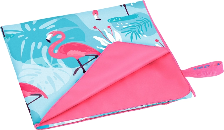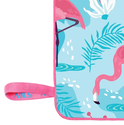 Stilfuldt mikrofiberhåndklæde fra NILS Camp med flamingomotiv – perfekt til ferie, sport og strand. Takket være det hurtigttørrende og supersugende materiale tørrer det hele kroppen på et øjeblik, er let, kompakt og nemt at vedligeholde.