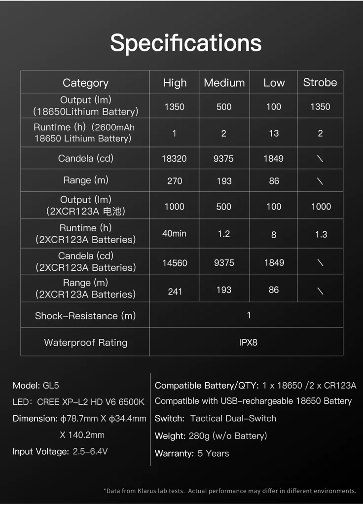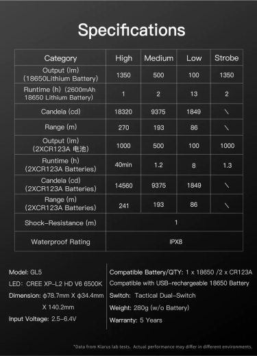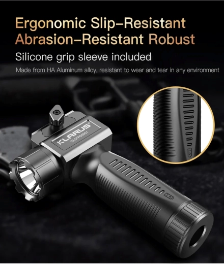 KLARUS GL5 er designet til krævende taktisk brug. Den polerede reflektor og CREE XP-L2 HD V6-LED skaber en skarp kegle af koldt hvidt lys 6500 K med høj lysstyrke og lang rækkevidde. Det gummibelagte hus med ergonomisk håndtag sikrer et fast greb og sikker betjening selv med handsker.