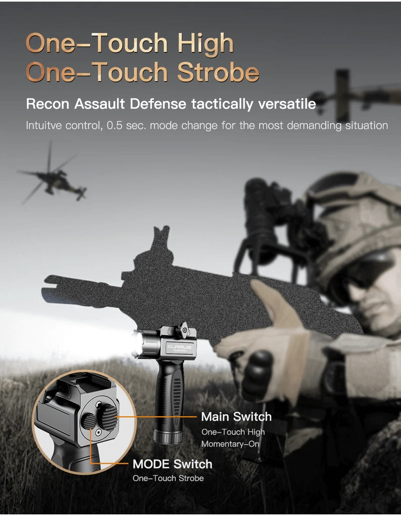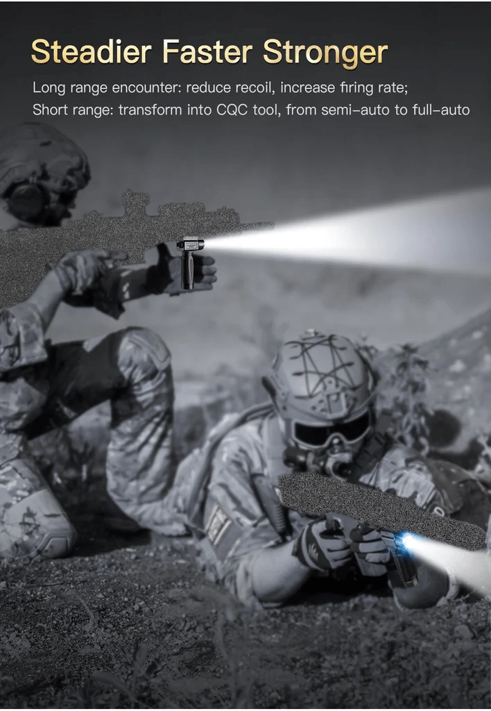- Hurtig montering på 1913 Picatinny-skinne, gummibelagt overflade og stabilt greb