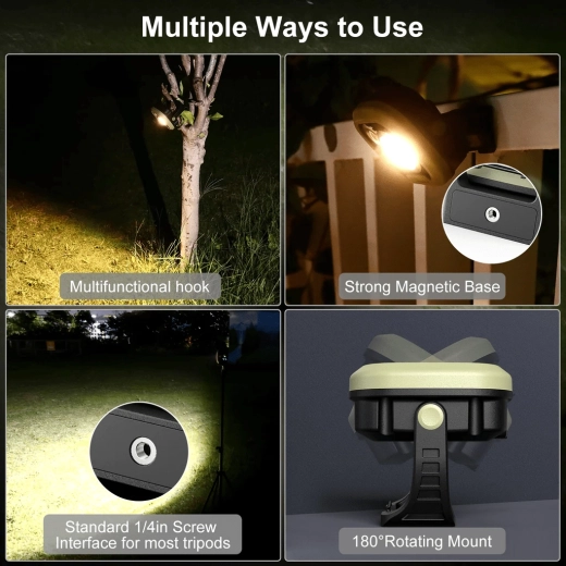 Det integrerede Li‑ion batteri 13.500 mAh (3,7 V) sikrer ekstra lang driftstid – op til 158 timer afhængigt af tilstand. Praktisk USB‑C giver hurtigere opladning, og powerbank‑funktionen holder telefon og andet elektronik kørende. Det 180° drejelige lampehoved og flere monteringsmuligheder (magnetisk base, krog, stativgevind) gør det let at rette lyset præcist derhen, hvor du behøver det.