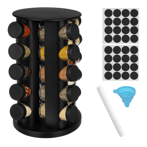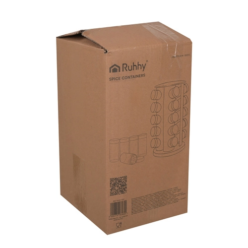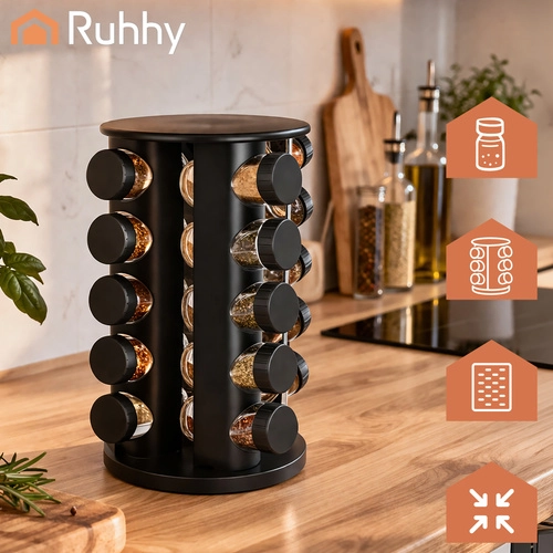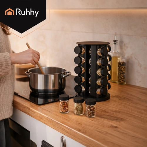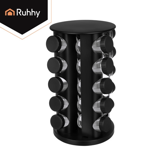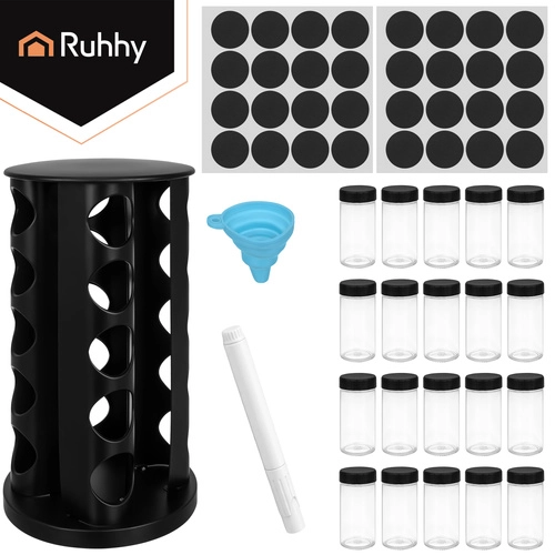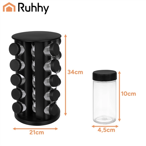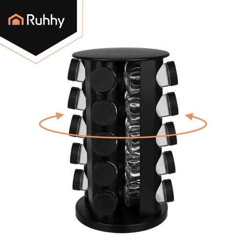 Organisér dit køkken smart og elegant. Det komplette RUHHY-kryddesæt tilbyder 20 glasbeholdere på 90 ml i et stabilt drejekarussel, som sparer plads og giver hurtig adgang til hver ingrediens. Det moderne sorte design passer i ethvert køkken og gør dine krydderier til en stilfuld dekoration.