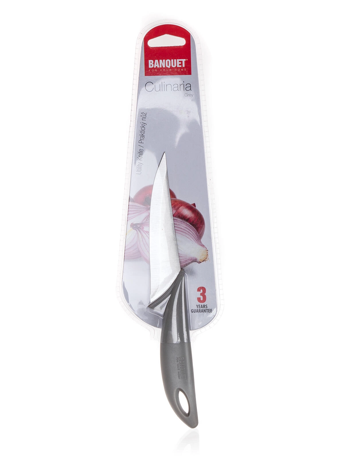 Praktisk kniv med stålklinge og ergonomisk plasthåndtag fra serien CULINARIA GREY, designet til alsidig anvendelse. Takket være klingelængden på 12 cm egner den sig perfekt til at skære grøntsager, frugt og mindre stykker kød. Den afbalancerede udformning sikrer et sikkert greb og behagelig håndtering ved madlavning i hverdagen.
