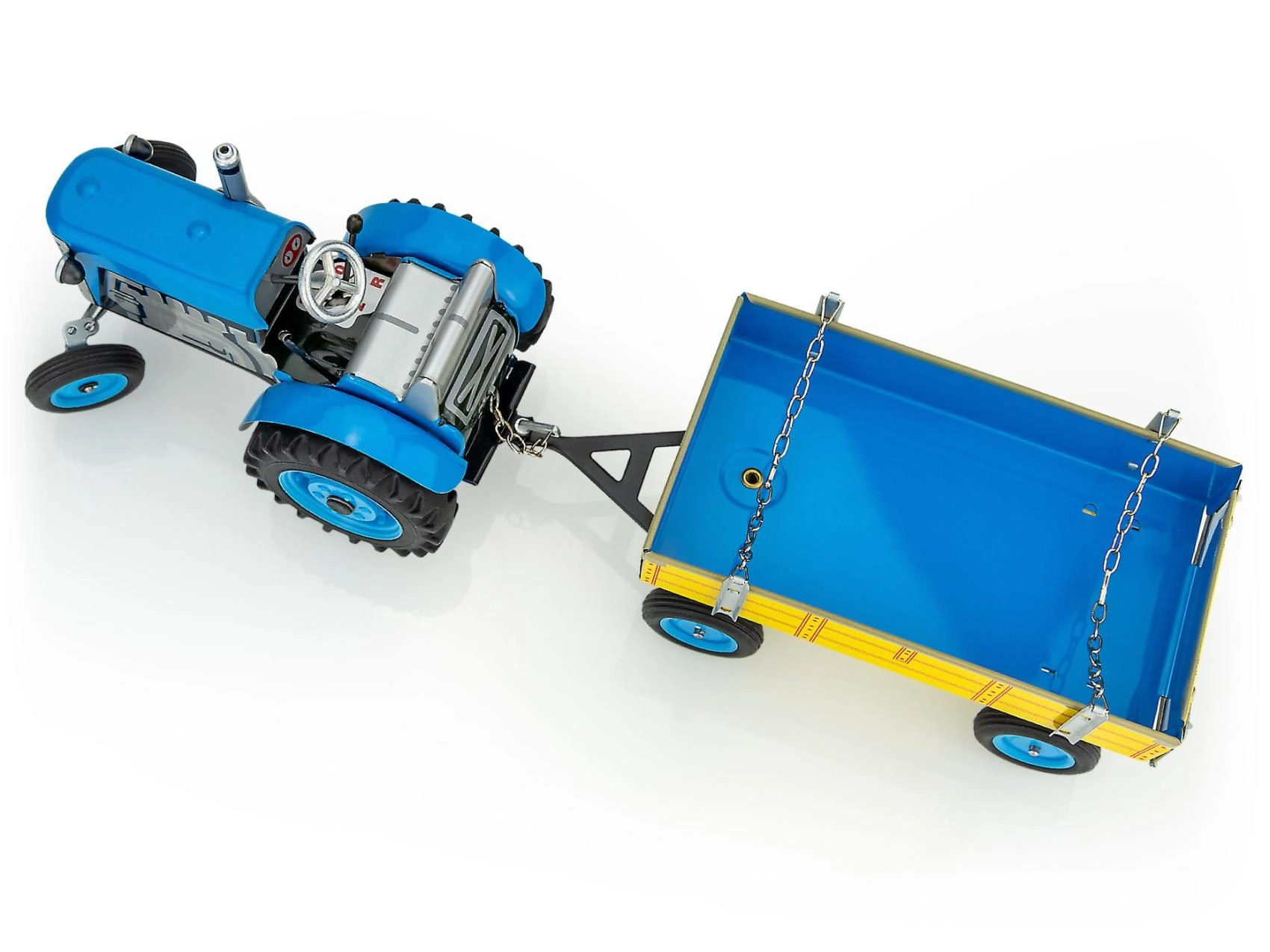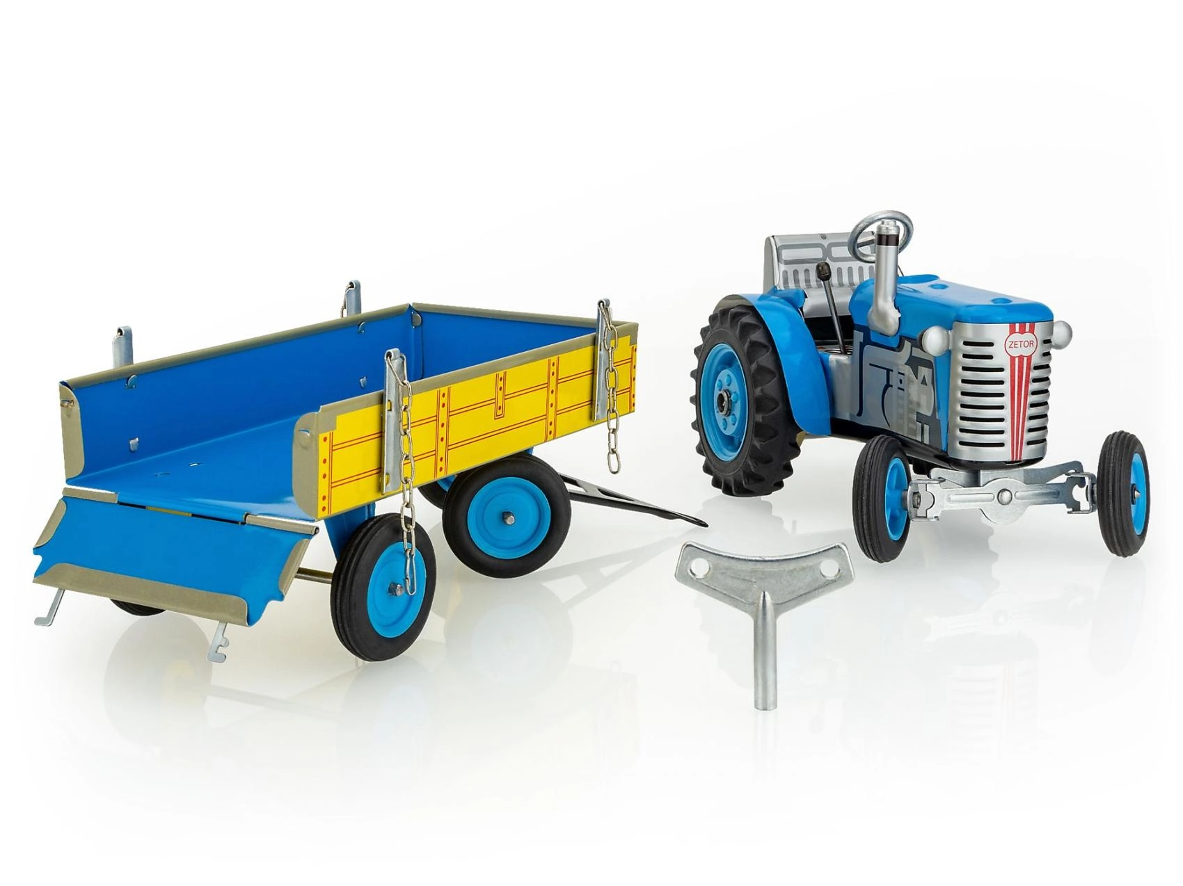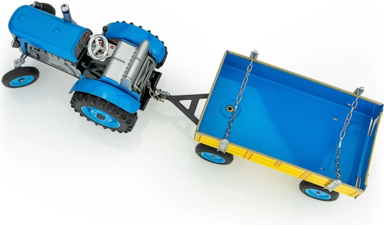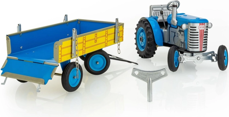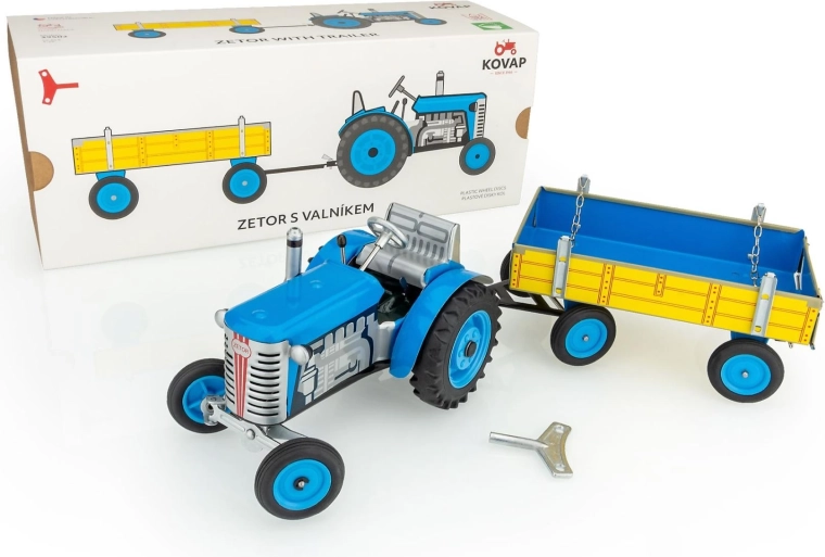 Denne præcist udførte metaltraktor ZETOR med ladvogn fra det tjekkiske mærke KOVAP drives af en klassisk optræksnøgle. Takket være den ægte gearkasse og håndbremsen giver den realistisk kontrol og timevis af sjov. Ideel til børn fra 3 år samt samlere af traditionelle bliklegetøj.