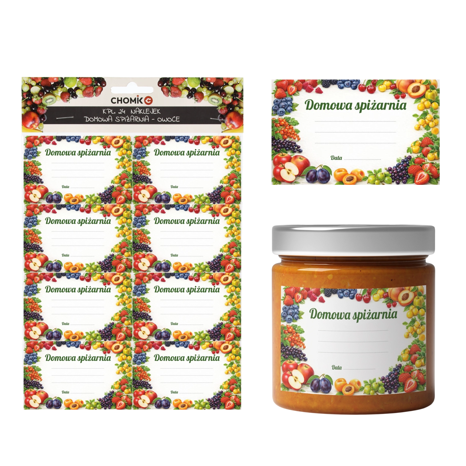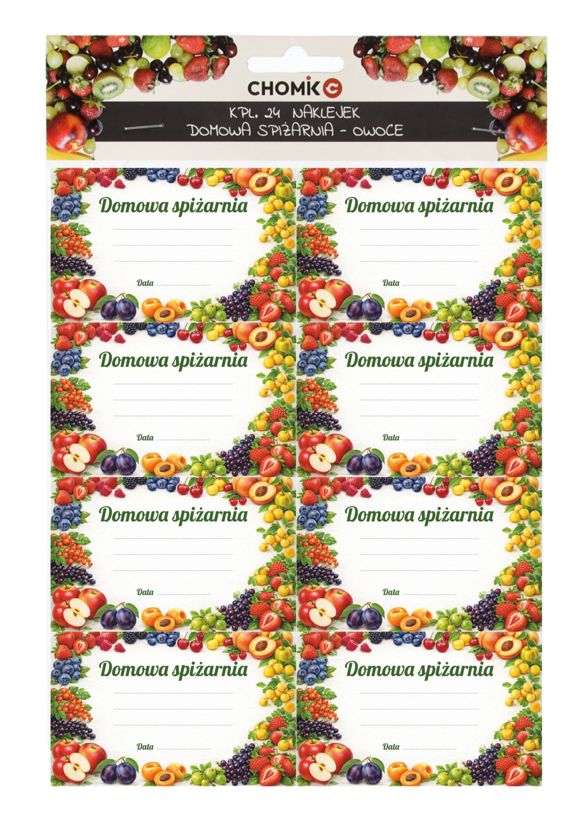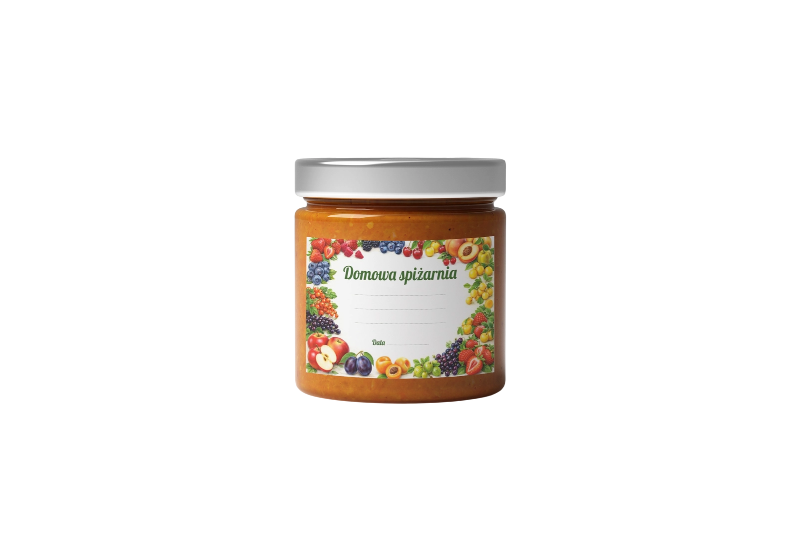 Sættet af etiketter “Domowa Spiżarnia – Owoce” er det ideelle valg til hjemmelavet syltetøj, marmelader, safter og kompotter. Hver etiket med en diameter på 5 cm har et attraktivt frugtmotiv og praktisk skrivefelt, så du nemt kan tilføje både opskriftsnavn og fremstillingsdato.