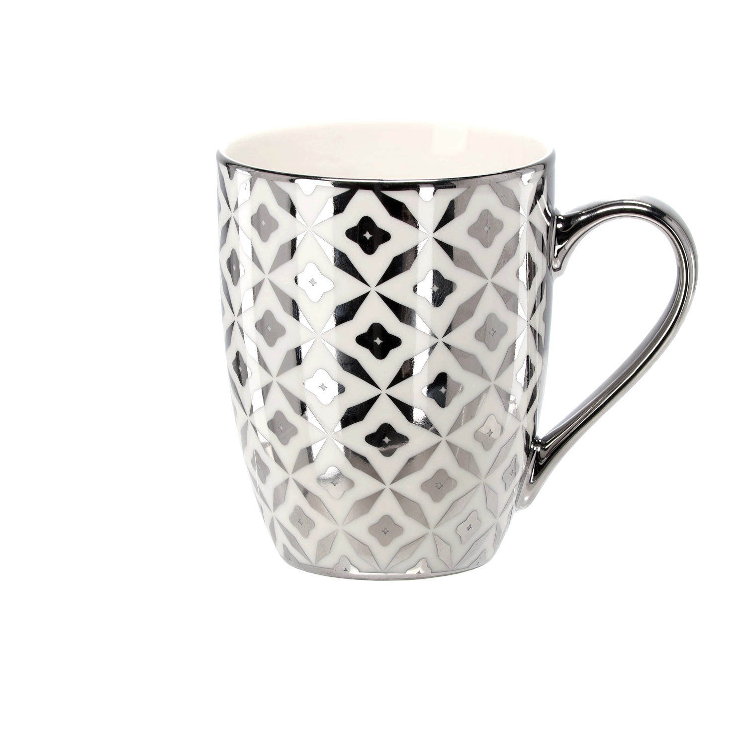 Metallisk sølv-hvid dekoration med geometriske motiver giver kruset et sofistikeret præg og fremhæver ethvert dækket bord.