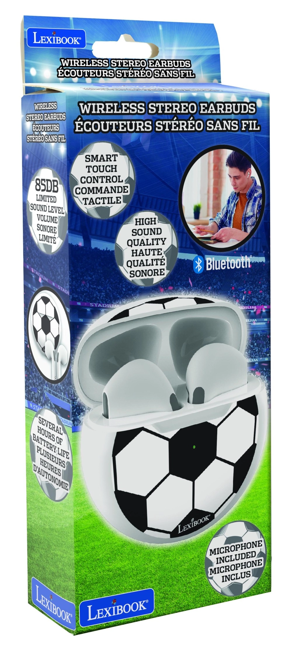 LEXIBOOK Fodbold trådløse hovedtelefoner er designet til børn og unge, der elsker sportstilen og vil lytte til musik, se videoer eller ringe uden kabler. Den ergonomiske in‑ear‑konstruktion sidder behageligt i øret, mens den indbyggede mikrofon og den intuitive touchbetjening sikrer nem brug i hverdagen.