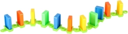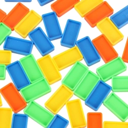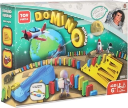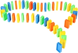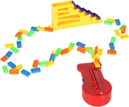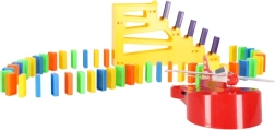 Pakkens indhold: 126× dominobrikker (4 farver), 2× fly med affyrer, baneelementer, 2× kugle, 1× figur, 12× base til domino, 52× læringsklistermærker (bogstaver, tal, matematiske tegn).