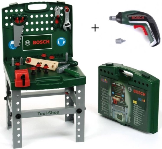 Bærbart BOSCH-værksted i kuffert med den batteridrevne skruetrækker Ixolino II. Tilbyder et bredt udvalg af tilbehør, sammenklappeligt design samt funktioner som højre/venstre rotation, lys og lyd med udskiftelige bits.