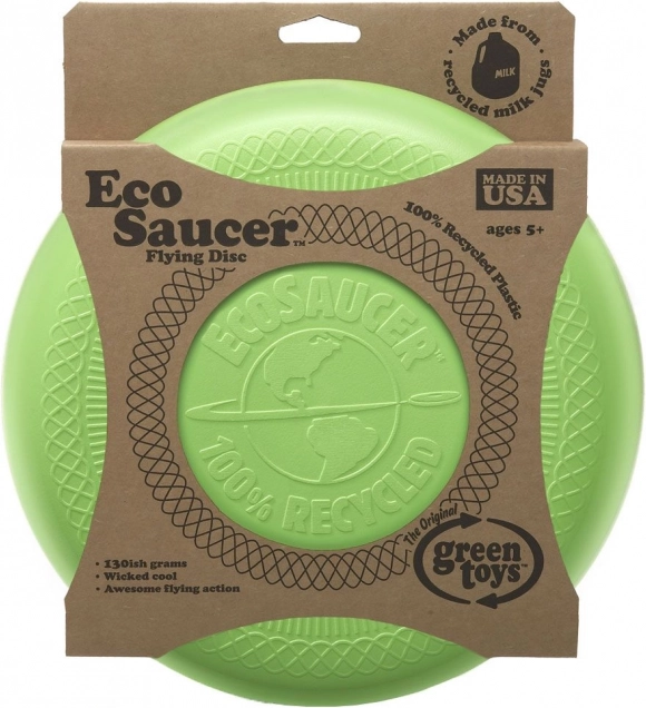 Den lette og robuste flyvende tallerken GREEN TOYS EcoSaucer vil glæde både små og store spillere. Fremstillet af genanvendt plast fra mælkeflasker, er den fri for BPA, PVC og ftalater, har en stærk og glat overflade og flyver fantastisk og hurtigt takket være den lave vægt. Nem vedligeholdelse – kan vaskes i opvaskemaskine.