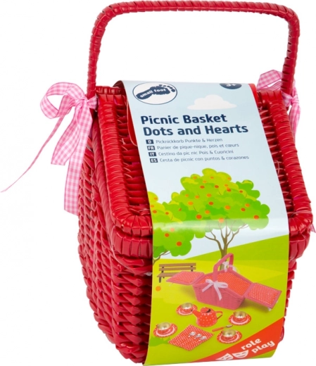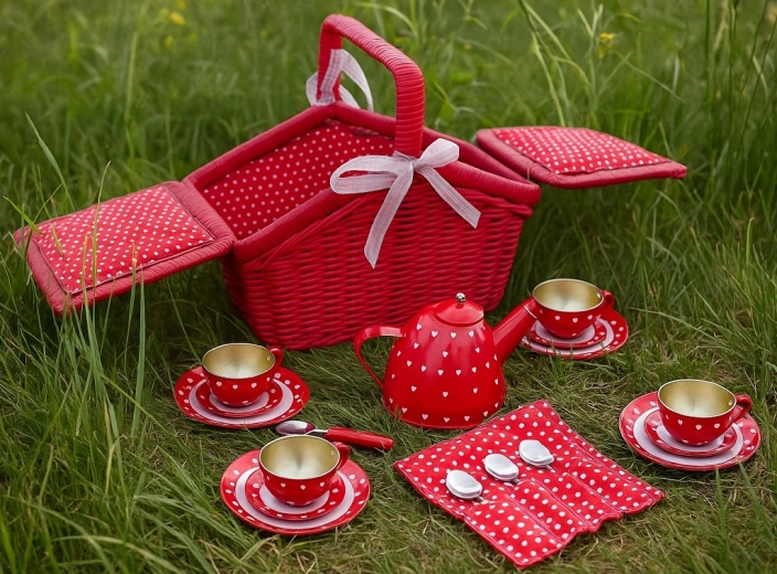 Den charmerende picnickurv med prikker og hjerter gemmer på et tesæt i metal, klar til ethvert fantasifuldt teselskab. Den robuste udførelse med justerbare velcrostropper og tekstilkant gør det nemt at transportere og opbevare alle dele. Børn øver social interaktion, motorik og kreativitet.