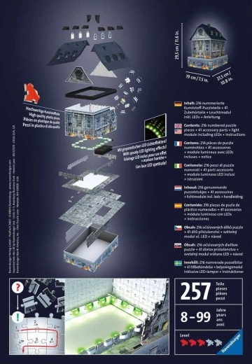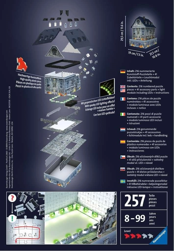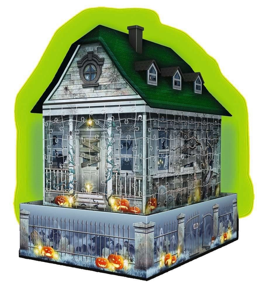 Træd ind i en mystisk verden, hvor hver brik passer med den velkendte præcision fra Ravensburger. Når puslespillet er samlet, fremstår et detaljeret spøgelseshus, der får liv i skumringen takket være glow-in-the-dark-effekten. Ideelt som gave til elskere af gåder og tematiske dekorationer.