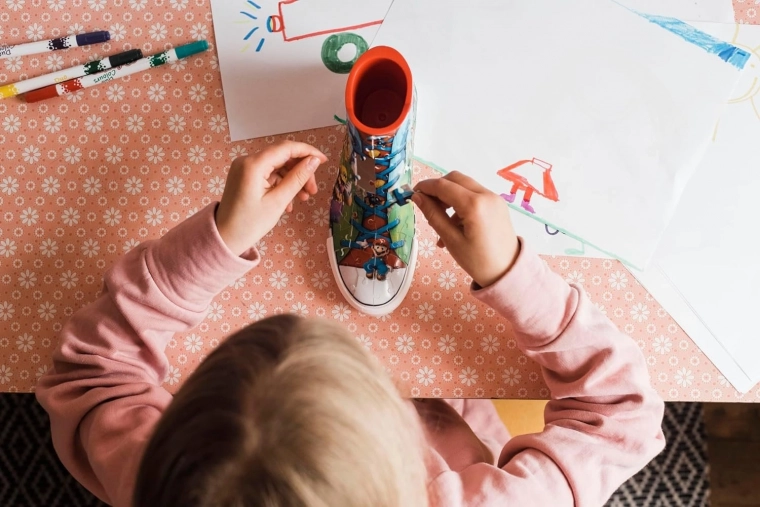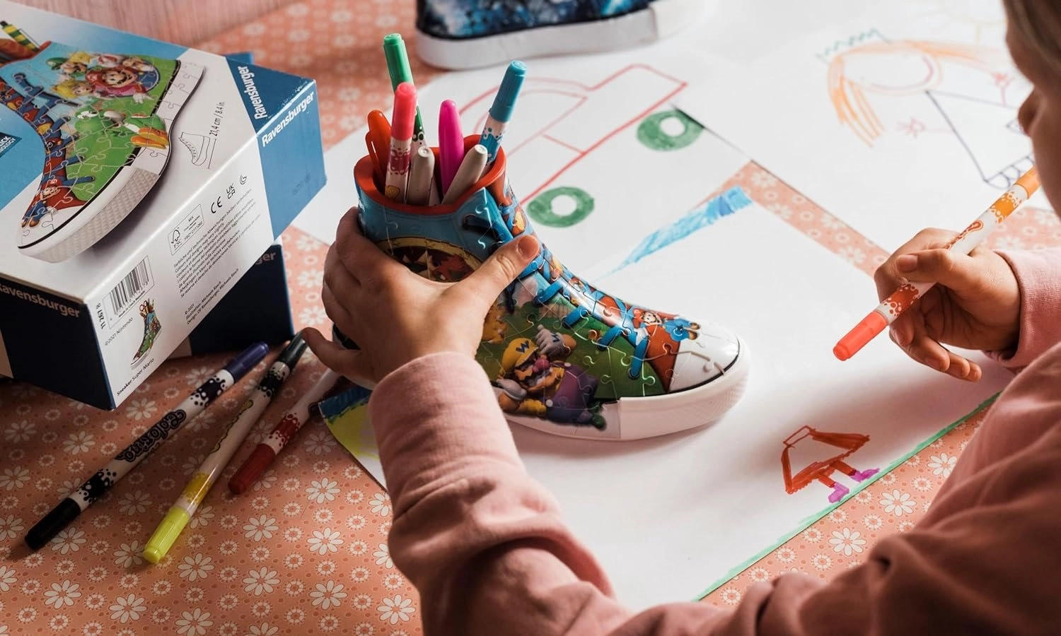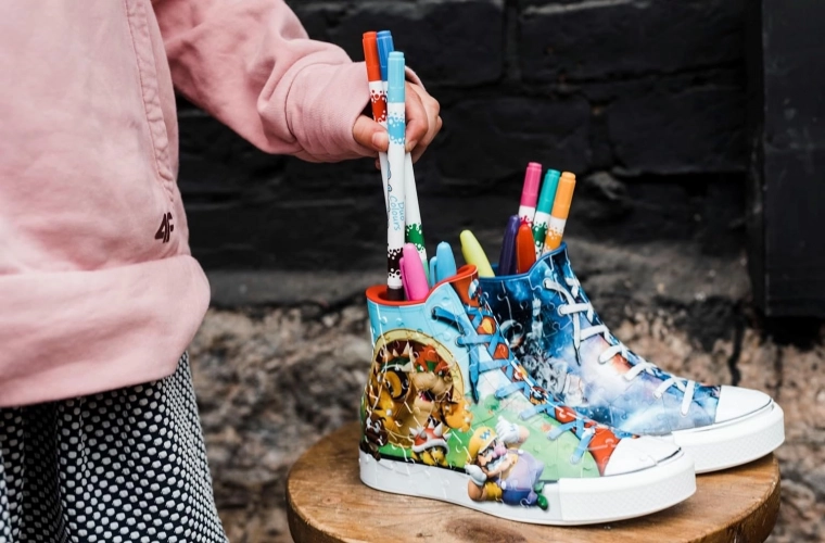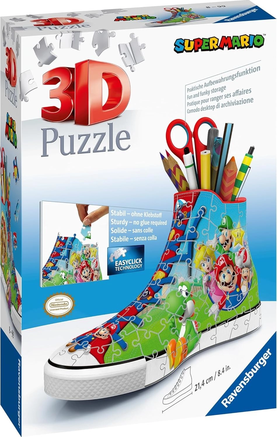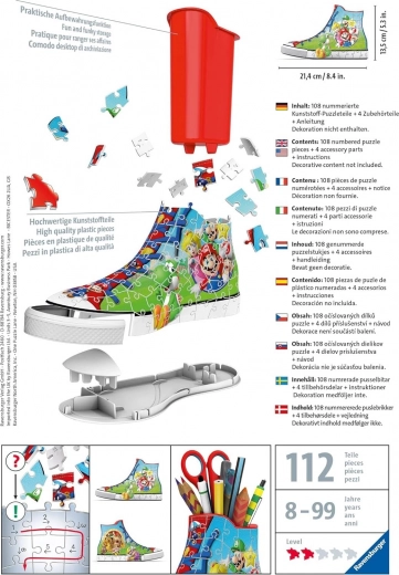 Lav denne klassiske sneaker af 108 plastpuzzlestykker med Super Mario-motiv og få den perfekte dekoration til værelset! Når den er samlet, venter der en ekstra bonus: du kan bruge den til pensler, blyanter osv.