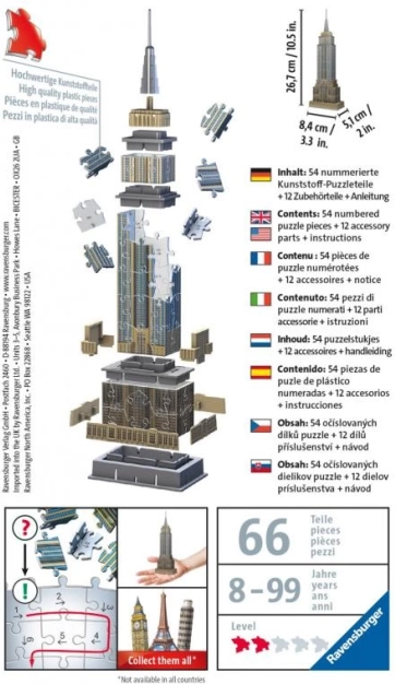 Oplev magien ved New Yorks ikoniske vartegn i et kompakt format. Mini 3D-puslespillet Empire State Building gengiver de arkitektoniske detaljer troværdigt, og takket være de dimensionsstabile plastdele holder modellen perfekt uden brug af lim. Samlingen er intuitiv – du kan følge motivet eller den praktiske nummerering af delene.