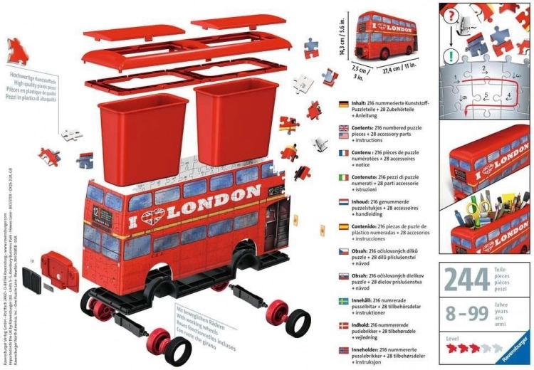 Farverig 3D-model af den berømte londonbus, som har to etager! Særlige buede eller fleksible brikker passer præcist på deres plads og muliggør en fascinerende opbygning.