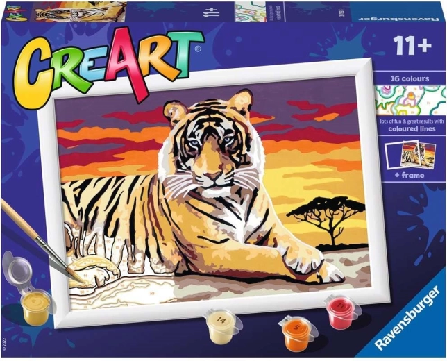 Denne pakke indeholder et lærred med nummererede felter, akrylfarver, pensel, staffeli og ramme.