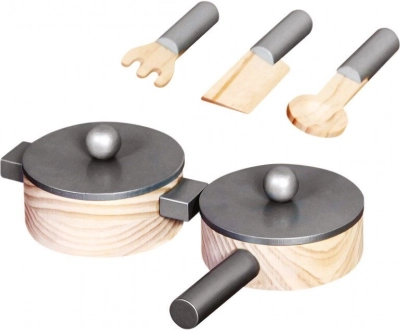 Pakken indeholder også et sæt gryder, en grydeske og en gaffel, som udvider legeoplevelsen.