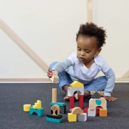 Forskellige former og størrelser af klodser indbyder til at bygge tårne, broer og dyrehistorier. Legen udvikler naturligt finmotorikken og hånd-øje-koordinationen.