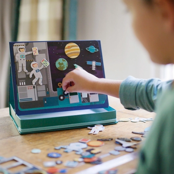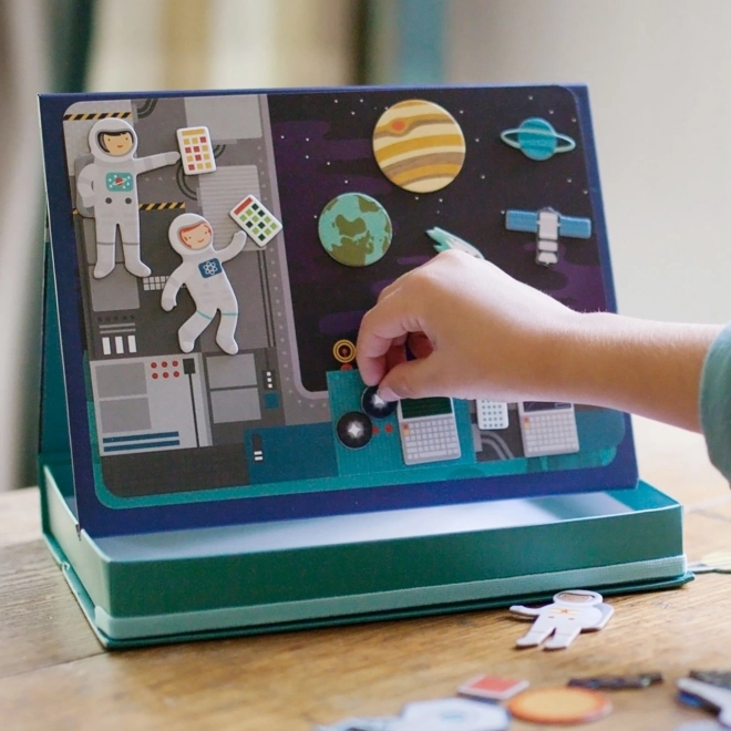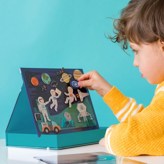 Opdag en kreativ verden med det magnetiske rumteater, som giver børn to baggrunde og mere end 50 magnetiske dele til at skabe deres egne historier. Bærbart legesæt med smart æske i staffeliform, hurtig oprydning takket være elastikbånd og solid, miljøvenlig konstruktion af genbrugsmaterialer sikrer langvarig underholdning hjemme og på farten.