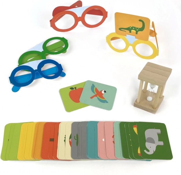 - 4 briller med kortholder, timeglas, 50 kort med illustrationer