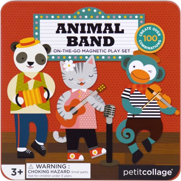 Denne magnetiske bog fra mærket PETIT COLLAGE er en fantastisk ledsager hjemme og på farten. Børn kan nemt sætte magneter på de indvendige scener, kombinere forskellige dele og skabe glade dyremusikere. Takket være den kompakte metaldåse opbevares alt sikkert, og intet bliver væk.