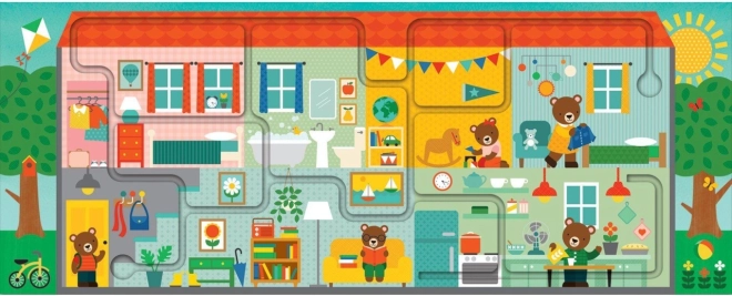 Dette kreative sæt fra PETIT COLLAGE kombinerer puslespil og interaktiv labyrint i ét spil, der både underholder og lærer børn noget. Når de 10 store brikker er lagt, dannes et langt billede af et hus (53 × 21,5 cm), hvor børnene følger den markerede rute med fingeren og samtidig opdager 20 skjulte genstande.