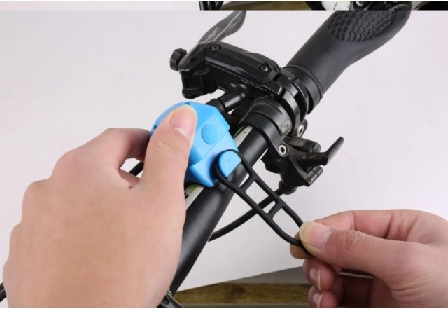 Monteringen klares på et øjeblik uden værktøj. Den universelle montering passer til styr med diameter 23,8–31,8 mm. Der er 5 lydtilstande; du skifter ved at holde knappen nede i 5 sekunder. Strømmen leveres af 2× CR2032, som medfølger i pakken.