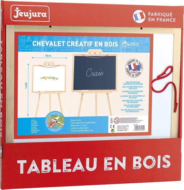 Jeujura træstativ med multifunktionel tavle tilbyder et alsidigt rum til tegning og skrivning. Den dobbeltsidede tavle er egnet til både kridt og tuscher, hvilket sikrer bred anvendelse under leg og læring. Træstativet er udstyret med opbevaringshylde, hvor børn kan lægge de nødvendige redskaber. I pakken medfølger tre kridt, en tusch og et sæt magnetiske bogstaver.
