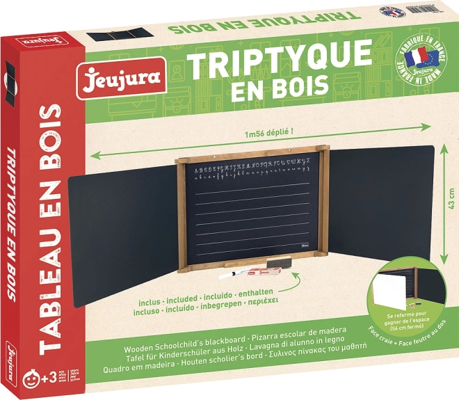 JEUJURA træ vægmonteret tredelt tavle 156×43 cm med kridt, tusch og svamp. Magnetisk, linjeret, miljøvenlig. Fremstillet i Frankrig.