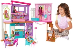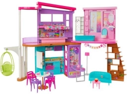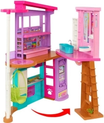 Feriehuset har to niveauer og seks legeområder som soveværelse, badeværelse og stue. Tilbyder moderne Barbie-design.